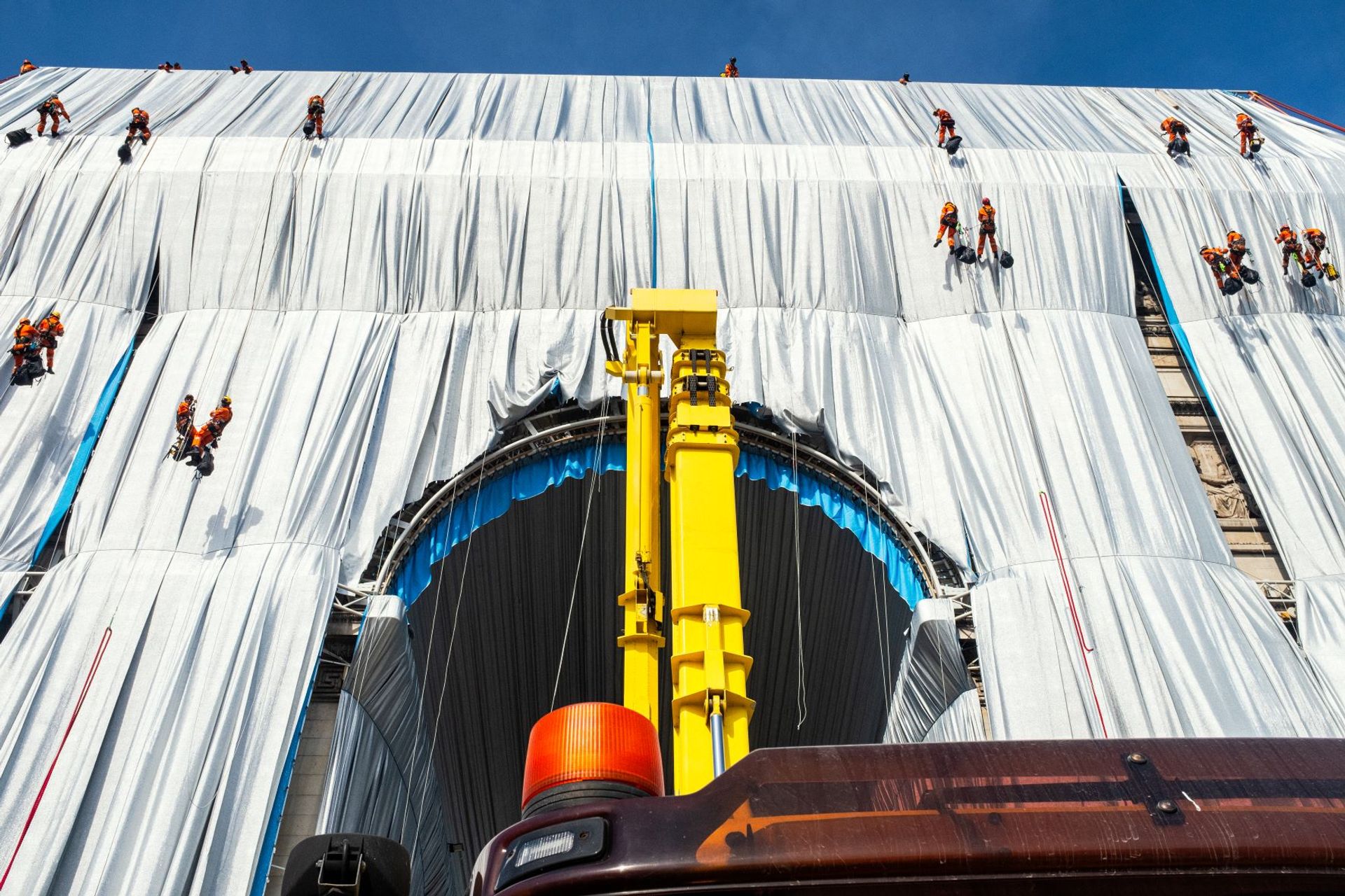 Installation des cordes autour du monument, à Paris, le 14 septembre 2021. Photo: Benjamin Loyseau. © 2021 Christo and Jeanne-Claude Foundation