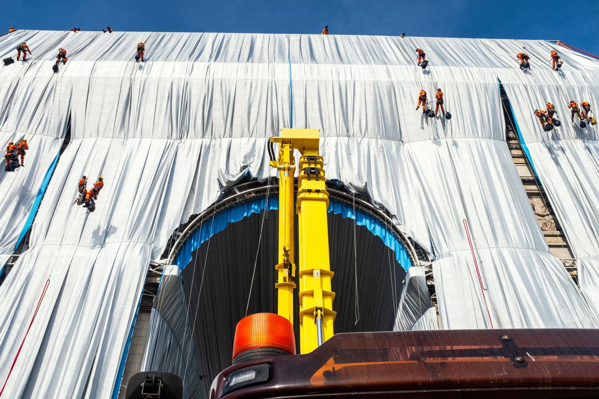 Depuis la Porte Dauphine, à Paris, lorsqu’on regarde vers l’autre extrémité de l’avenue Foch, une forme informe s’insinue par-delà les frondaisons qui bordent ladite artère. Une forme blanche et mate, hissée en lieu et place du célèbre monument qui y trônait jusqu’alors en majesté : l’Arc de triomphe. Disparu ledit monument, ou presque… Au fur et à mesure que l’on s’approche de la place Charles-de-Gaulle – ex-place de l’Étoile –, le constat s’impose : absents les boucliers et les glaives dressés de l’attique, effacée la frise sculptée qui couronnait l’entablement, exit même les quatre gigantesques hauts-reliefs qui ornaient les pied-droits de l’édifice. L’Arc de triomphe, en réalité, a été entièrement « empaqueté » dans quelque 25 000 m2 de textile bleu-argent, maintenus par pas moins de 3 000 mètres de corde rouge. Reste qu’il n’en est que davantage présent, et sa puissance, par le truchement de cette « apparition-disparition », étrangement amplifiée. L’installation est une œuvre posthume des artistes Christo (1935-2020) et Jeanne-Claude (1935-2009), sa femme. Une œuvre éphémère intitulée L’Arc de Triomphe, Wrapped et pensée il y a exactement 60 ans. Ce projet qu’ils avaient à l’époque jugé eux-mêmes « trop ambitieux à réaliser » n’a d’ailleurs jamais été proposé aux différentes autorités avant 2017. Il est désormais visible du 18 septembre au 3 octobre 2021.