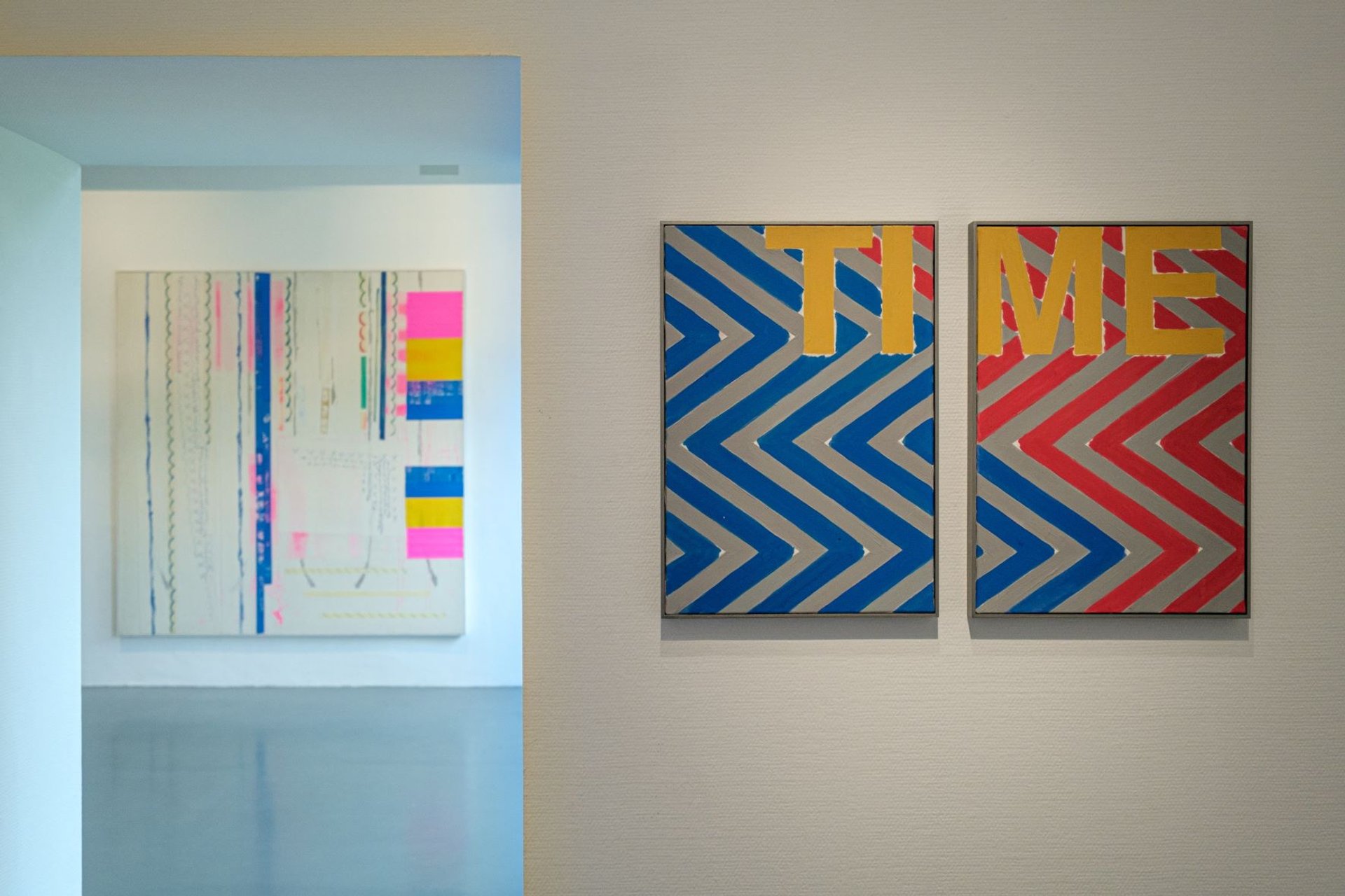 Vue de l’exposition d’Agnès Thurnauer. À gauche, au fond: une toile de la série Mapping The Studio; à droite, dans la première salle, un diptyque de la série Prédelles. Photo : D.R.