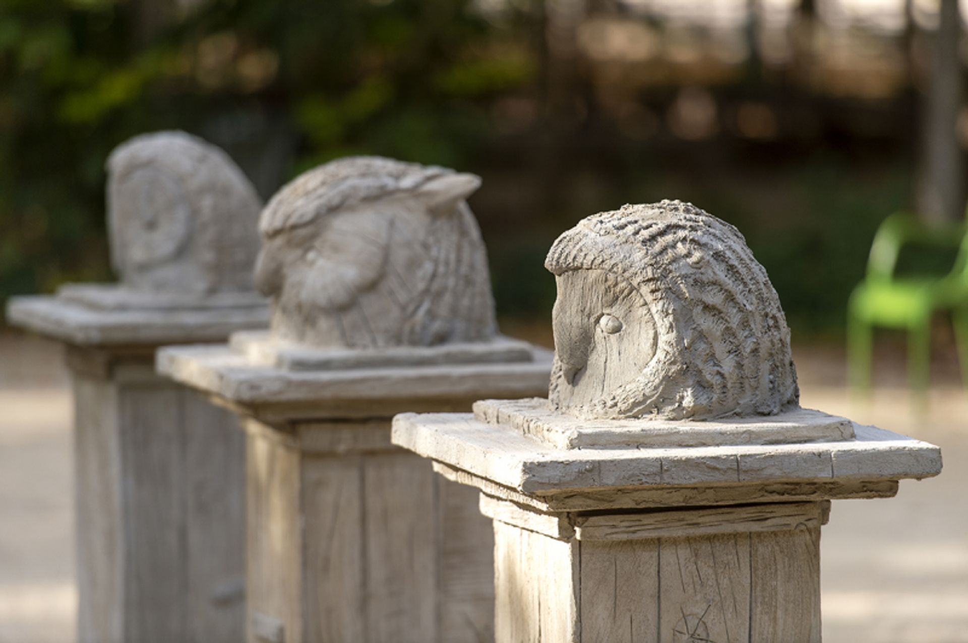 La sculpture animalière traditionnelle, elle, est sens dessus dessous. Au pied du musée de l’Orangerie, Stefan Rinck propose, ainsi, deux totems monumentaux en calcaire – It Owl et Rabbiator –, mixant, avec humour, architectonique antique et culture populaire. Un animal est en vedette : la chouette. Chez Lionel Sabatté, réalisée en fers à béton et en ciment, elle prend l’aspect d’une Chouette Chevêche, dont la tête trône au sommet de l’armature et le corps se fait accueillant. Usant de la technique de la rocaille, Laurent Le Deunff, lui, pose trois « bustes » quasi vernaculaires – une Chouette des neiges, un Hibou grand-duc et une Chouette lapone – sur des socles en faux bois, mais vrai ciment, d’un gris-beige soyeux, le tout sous l’œil d’adeptes de Qi Gong en pleine activité.