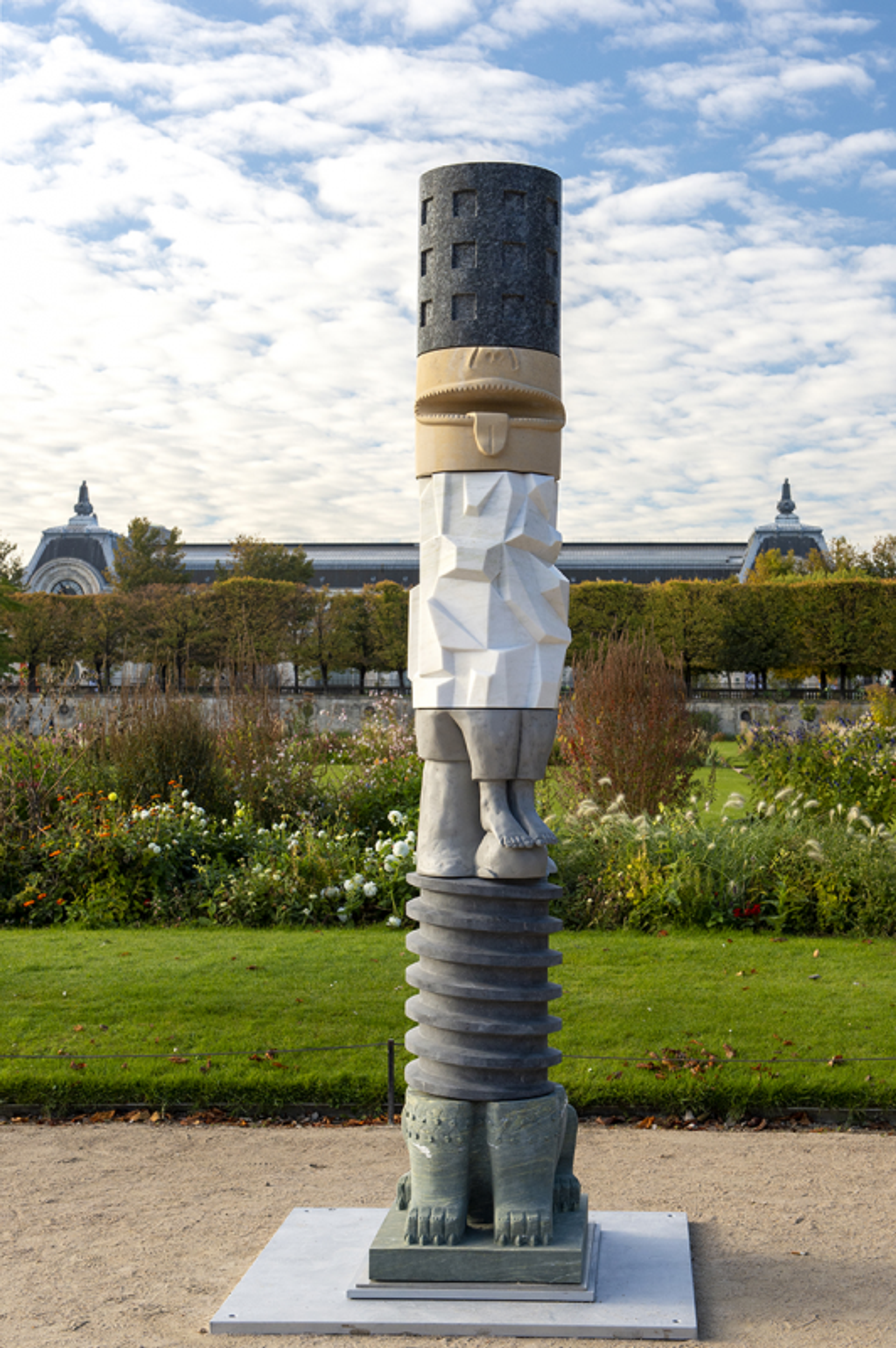Au milieu du mobilier caractéristique des espaces verts parisiens, un banc détonne : celui de Lilian Bourgeat, baptisé Double Banc. La raison ? D’abord, il est d’un rouge pompier, dans un univers où le vert profond est réglementaire; ensuite, il est surdimensionné – 2,5 fois plus grand qu’un banc standard –, si bien que le public, toujours en quête d’un cliché insolite, y accède en se faisant la courte échelle. Côté réseaux sociaux, l’objet, lui, se hissera à coup sûr sur le podium. On l’aura compris, le jeu avec la sculpture est, ici, légion. Avec Achronie 25, Marion Verboom hisse une splendide colonne bigarrée, façon carotte géologique, constituée de six matériaux différents – quartzite vert, pierre bleue du Hainaut, marbre d’Angola, pierre de Bugey, granite du Labrador et fonte d’aluminium –, contrepoint parfait aux sculptures classiques alentour.