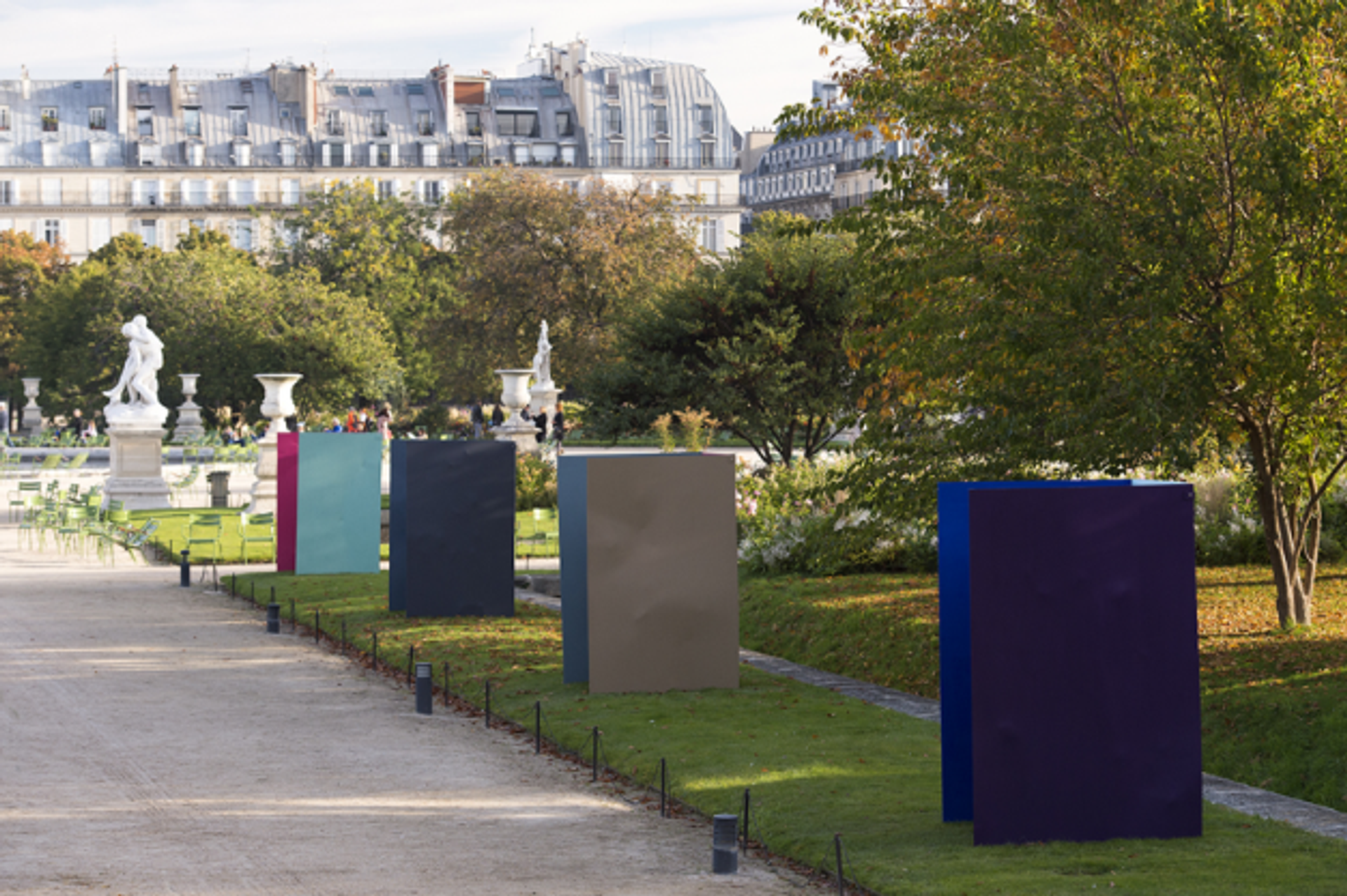 D’aucuns s’amusent, eux, à délimiter l’espace autrement. Ainsi Norbert Kricke installe-t-il deux œuvres imposantes en inox, Raumplastik Grosse F, et néanmoins filiformes, tels des trombones (de bureau) géants désarticulés, qui dessinent de nouveaux cadrages avec le Louvre en arrière-plan. Non loin, Michael Kienzer installe sur une pelouse, en enfilade et en un équilibre fragile, quatre Falter, pièces faites de panneaux en tôle laquée dont le vide qu’elles contiennent, évoque peut-être quelques sculptures disparues. Dans un bassin, côté Louvre, Vincent Mauger a déposé huit blocs de polystyrène – Sans titre – qui évoluent à la surface de l’eau au gré du vent, dessinant un étonnant paysage mental.