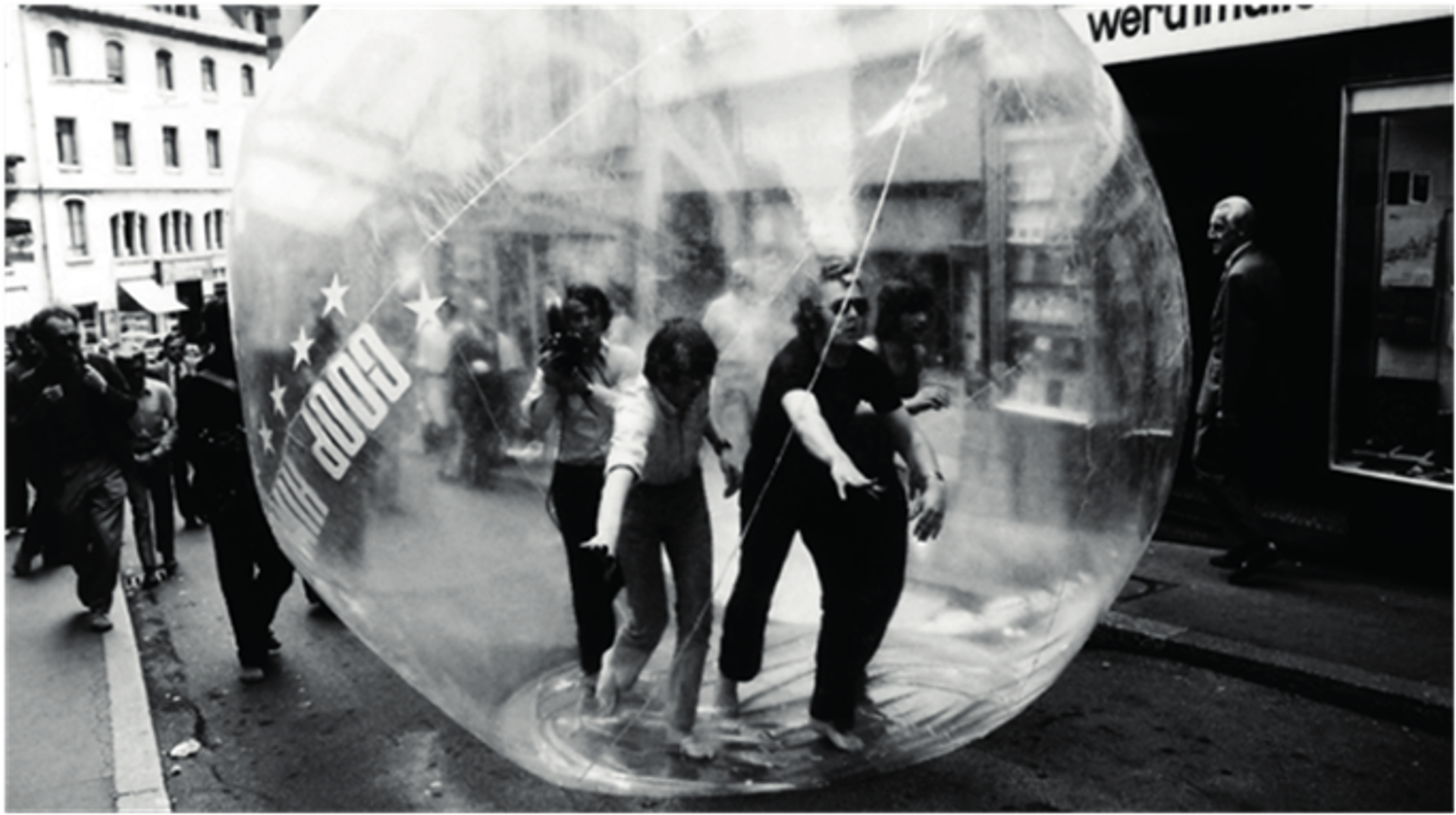 Ce principe des sculptures gonflables ne tardera pas, lui non plus, à être transposé dans le monde du design. Ainsi en est-il du Fauteuil moléculaire de Bernard Quentin ou de la chauffeuse Apollo de Quasar, gonflables « ludiques » en quête, en pleine période pop art, de nouveaux modes de vie. Nouveaux modes de vie utopiques, sinon critiques également, à l’instar des actions politiques et urbaines que mène la scène radicale autrichienne : Haus-Rucker-Co, Coop Himmelb(l) au, Günther Domenig & Eilfried Huth… On peut, ici, découvrir plusieurs « objets » phares issus de ces performances viennoises, comme le Mindexpander 1 (Haus-Rucker-Co), siège surmonté d’un « casque » surdimensionné à deux « globes » transparents, tels des yeux de mouche multidirectionnels. Trois importantes expositions entérineront l’usage des formes pneumatiques : « Structures gonflables », concoctée par le groupe Utopie au musée d’art moderne de la Ville de Paris, en 1968 ; les Documenta 4 (1968) et 5 (1972), à Cassel (Allemagne) ; enfin, l’exposition universelle d’Osaka (Japon, 1970), qui consacre notamment l’architecte nippon Yutaka Murata, auteur, entre autres, d’un détonnant pavillon pour la firme Fuji. Ces manifestations sont, ici, décryptées et documentées à l’envi.