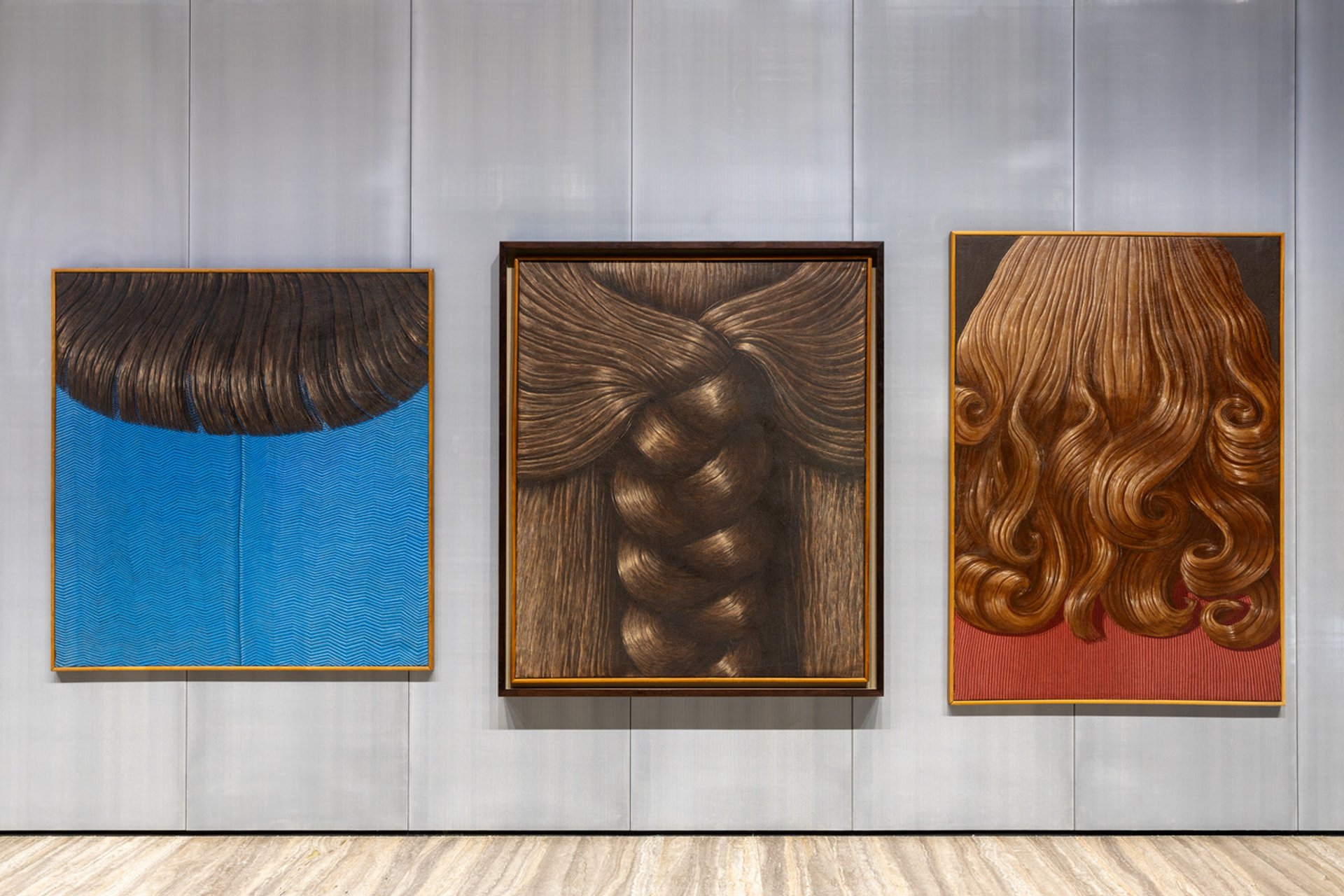 Vue de l’exposition « Domenico Gnoli », Fondazione Prada, Milan. De gauche à droite : Red Hair on Blue Dress, 1969 ; Braid, 1969 ; Curly Red Hair, 1969 Photo : Roberto Marossi. Courtesy Fondazione Prada.