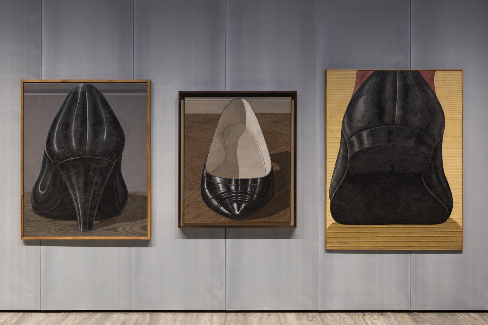 Vue de l’exposition « Domenico Gnoli », Fondazione Prada, Milan. De gauche à droite : Lady’s Shoe, 1969 ; Scarpa di fronte, 1967 ; Sous la chaussure, 1967 Photo : Roberto Marossi. Courtesy Fondazione Prada.