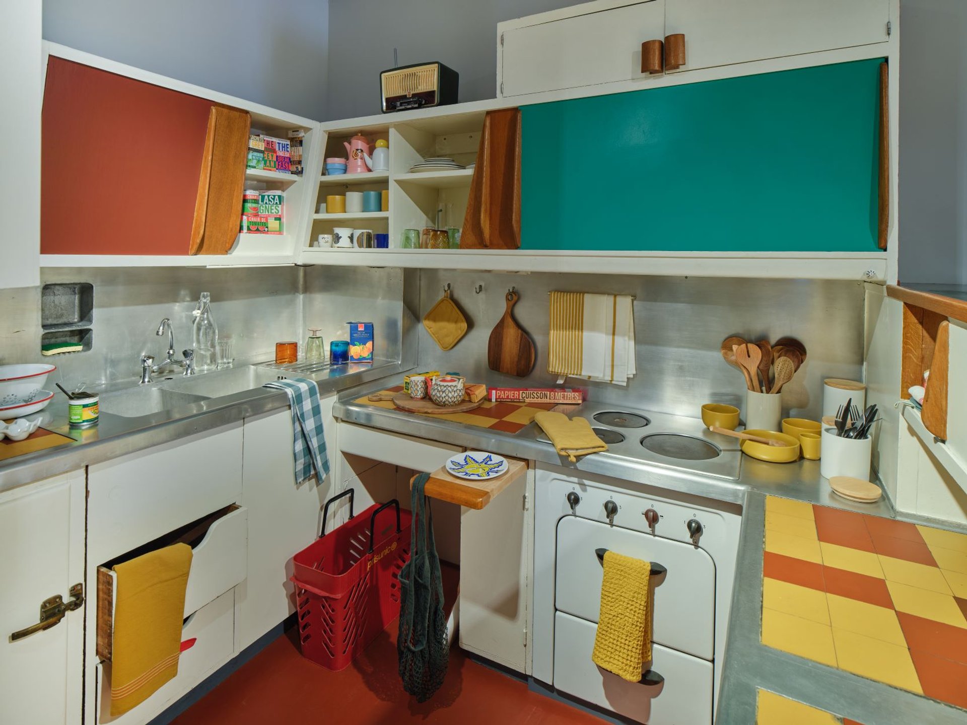 Vue, au 8e étage, de l’exposition « Le design pour tous : de Prisunic à Monoprix, une aventure française », la cuisine dessinée, en 1952, par Charlotte Perriand pour l’unité d’habitation de Marseille de Le Corbusier. Courtesy MAD, Paris