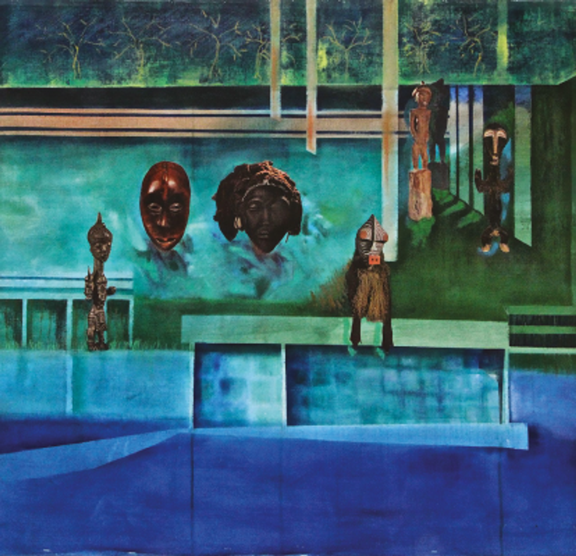 Obi Okigbo, The Shrine, s.d., huile sur toile, poudre de pigments, collage.