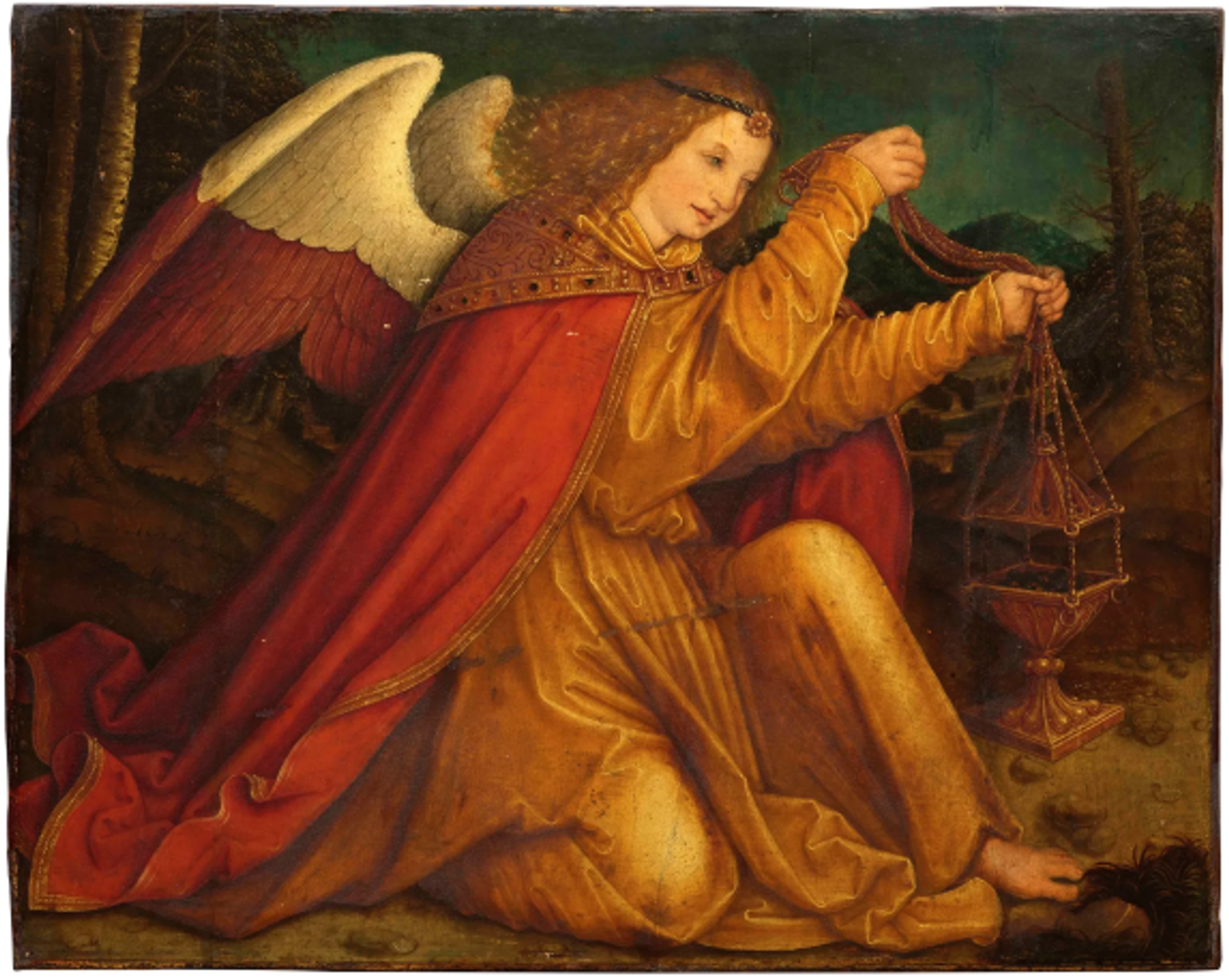 Bernhard Strigel, Ange thuriféraire vêtu d’une tunique jaune, vers 1520, panneau de chêne, 48,8×61,2 cm. Courtesy Artpaugée