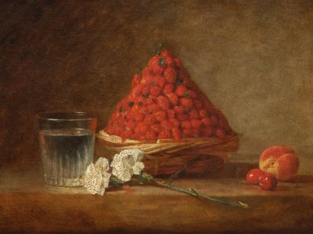 Charles Blanc, le premier à mentionner ce « morceau exquis » dans la littérature un an avant les Goncourt, s’était émerveillé lui du chatoiement des reflets vermeils de la belle pêche. Et puis, il y a ce verre d’eau magique et les deux cerises. Il y a surtout ces délicieuses fraises des bois, tout aussi uniques dans l’œuvre de Chardin que les œillets. Il est impératif de voir le tableau pour que la magie opère. À quelques centimètres de distance, les fraises frôlent l’abstraction. Les couches translucides de laques de garance, de vermillon, de rouges de cadmium, de carmin, s’entremêlent alors qu’en s’éloignant, les formes prennent vie et s’imposent au spectateur. Non sans malice, Stéphane Pinta, l’expert du Cabinet Turquin, cite la célèbre scène de Vertigo d’Hitchcock où l’image évolue et se transforme au fur et à mesure que l’on s’en approche. Chardin était un illusionniste et ce tableau, plus que tout autre, mérite d’être vu et revu, pour en découvrir tous les effets sur notre œil et notre imaginaire. André Gide trouvait en 1937 dans ce panier de fraises « le recueillement d’une aussi pesante charge d’âme que dans son Bénédicité ».