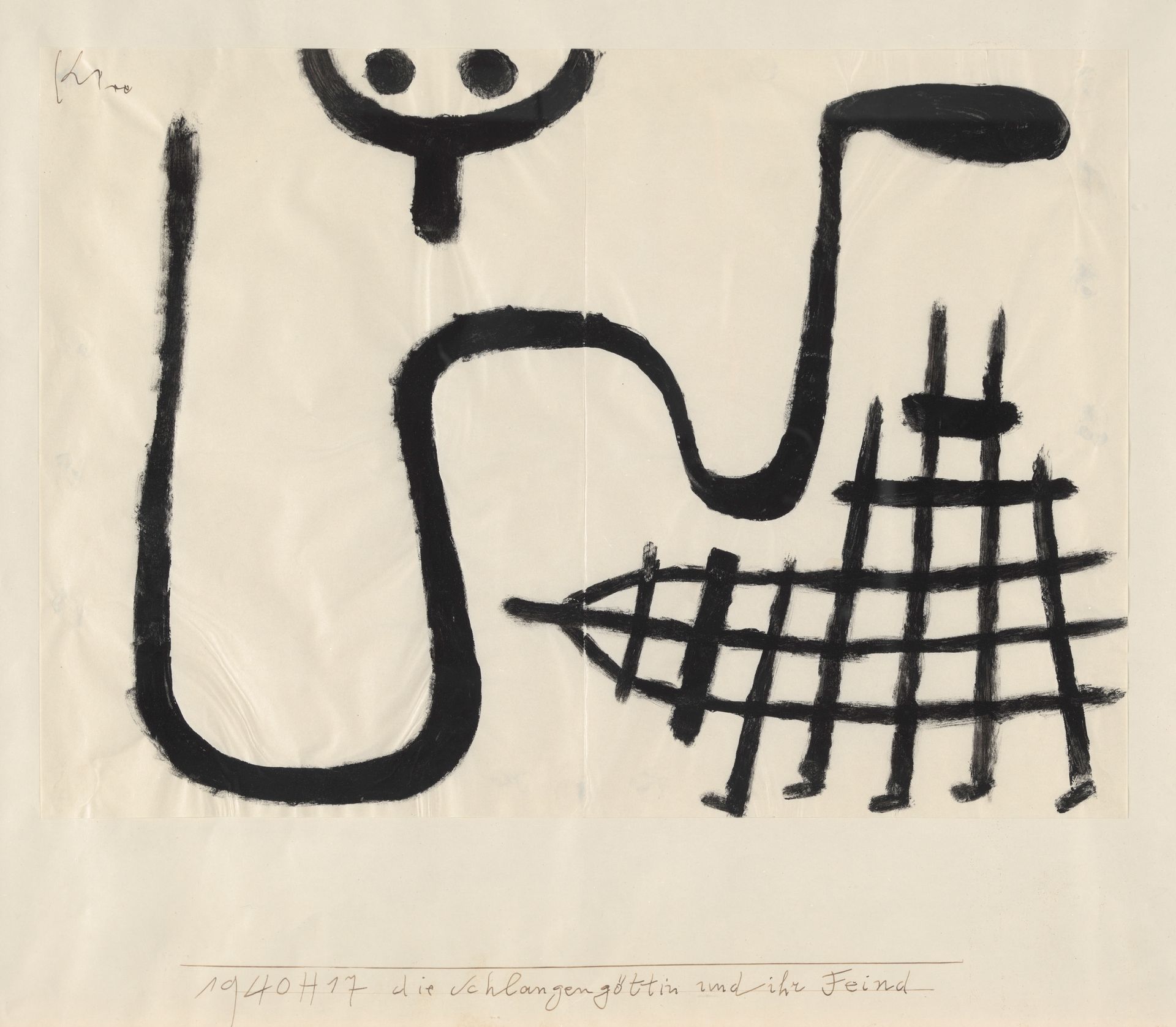 Paul Klee, Die Schlangengöttin und ihr Feind [La Déesse-serpent et son ennemi], 1940, couleur à la colle sur papier sur carton, collection particulière en dépôt au Zentrum Paul Klee, Berne. © Zentrum Paul Klee, Berne