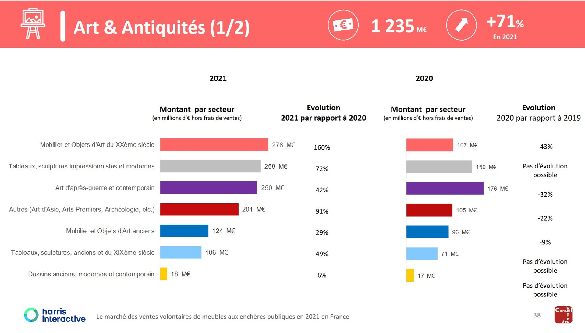 Selon le nouveau rapport annuel du Conseil des ventes publié hier, le secteur des enchères a connu un bond spectaculaire de 39,6 % en 2021, toutes spécialités confondues, pour un total hors frais de 4,05 milliards d’euros. « Ce qui va bien au-delà d’un simple rattrapage de la baisse constatée » en 2020, qui était alors de -14 %, note le CVV. Le secteur Arts & Objets de collection a connu en 2021 une hausse record de 54 %, et de 19,5 % comparé à l’année d’avant le Covid, en 2019. Le montant cumulé des 20 premières maisons de ventes est de 3 milliards d’euros, pour 64 % du volume total des ventes. Le secteur de l’art d’après-guerre et contemporain reprend des couleurs, avec une progression de 42 % comparé à 2020. Sur un total de 1,2 milliard d’euros cumulé par le secteur « Art & Antiquités », il engrange 250 millions d’euros, presque à égalité avec celui très vaste du « mobilier et objets d’art ».