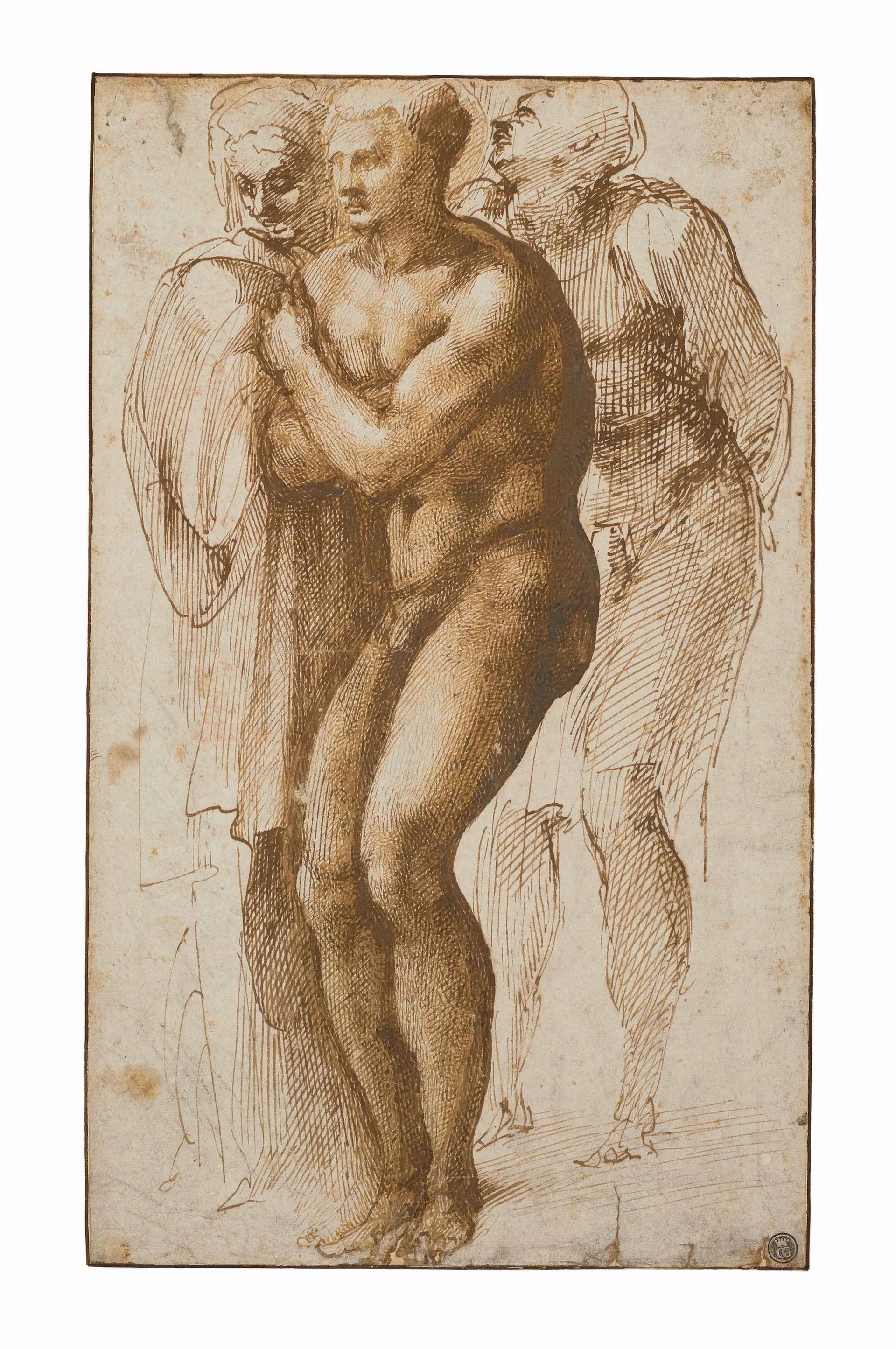 Michel-Ange Buonarroti, Un jeune homme nu (d’après Masaccio) entouré de deux autres figures, plume et encre brune, 33 x 20 cm. © Christie’s