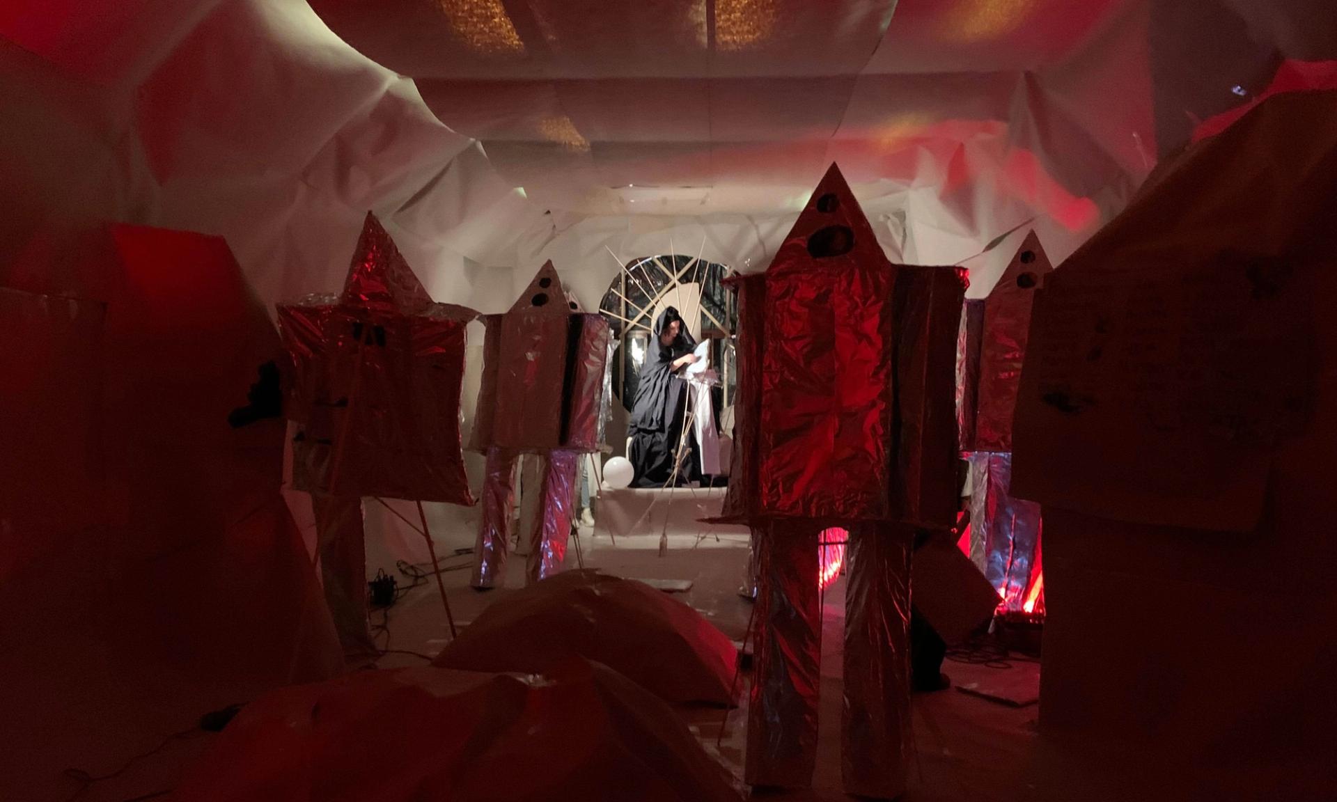 Le Pavillon du Kazakhstan dans son état actuel, accueillant des performances du Collectif Orta. Courtesy Collectif Orta