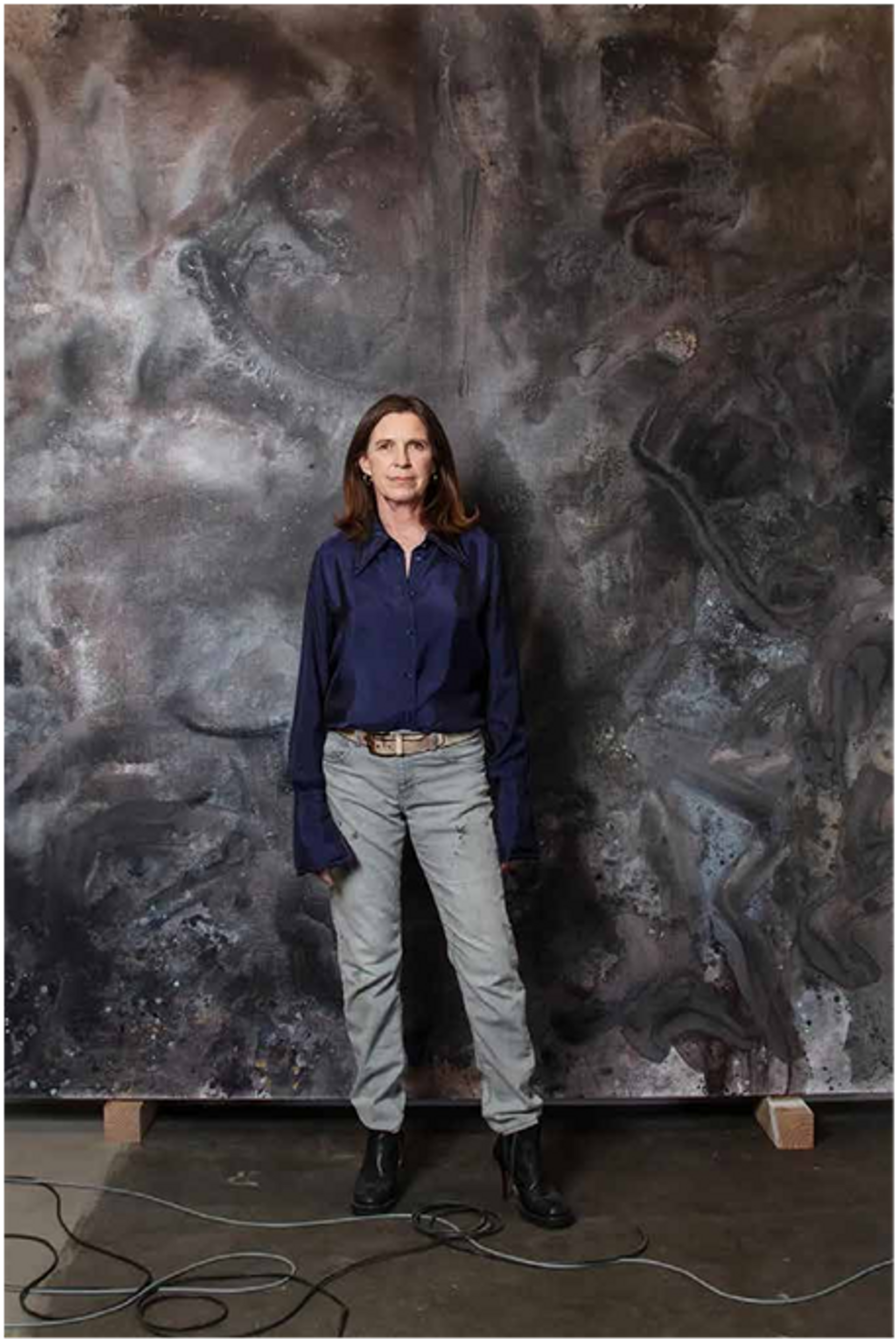 Mary Weatherford devant son œuvre The Flaying of Marsyas-3500 Spectra, 2021-2022. Photo: Elena Durham. Courtesy Gagosian
