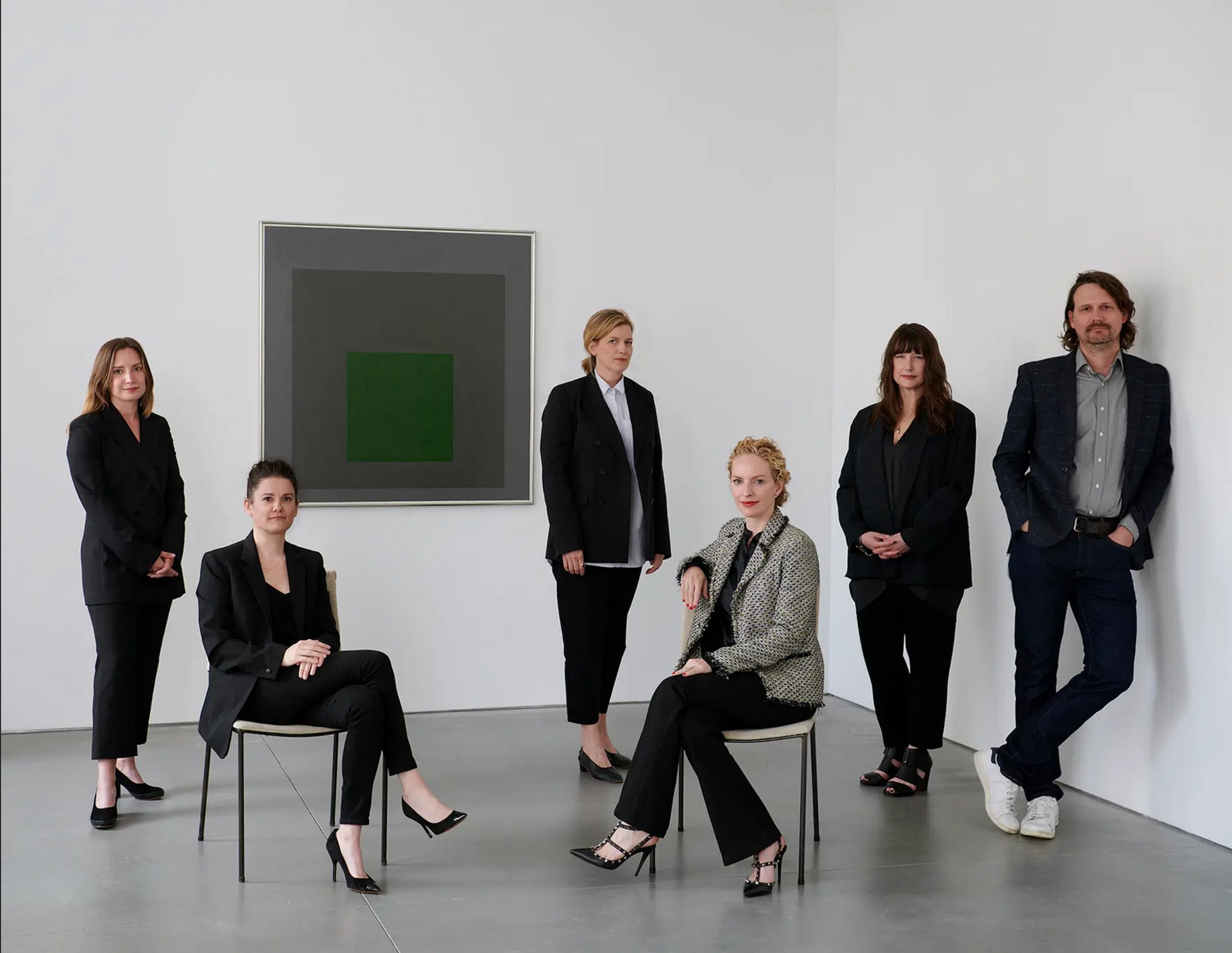 Équipe de la galerie David Zwirner dédiée au second marché (de gauche à droite) : Katherine Lukacher, Meghan Hill, Alexandra Whitney, Kristine Bell, Kelly Reynolds et Cy Amundson. Œuvre : Josef Albers, Homage to the Square : Embedded, 1963 . © The Josef and Anni Albers Foundation / Artists Rights Society (ARS), New York. Courtesy The Josef and Anni Albers Foundation and David Zwirner. Photo : Jason Schmidt