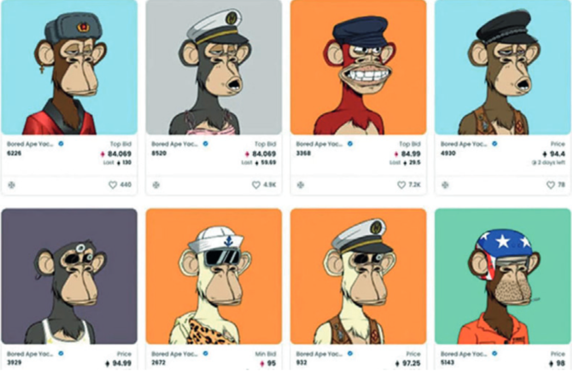Mais il y a aussi les regroupements plus récents de NFT : les avatars de type « photo de profil », à l’instar de Bored Apes, qui font partie de collections conférant à leur détenteur une sorte de privilège exclusif, comme l’accès à des événements, à la propriété intellectuelle, à d’autres jetons et à des forums de discussion. Ces NFT s’apparentent davantage à des actions ordinaires, ou à un actif numérique comme le Bitcoin ou l’Ethereum.