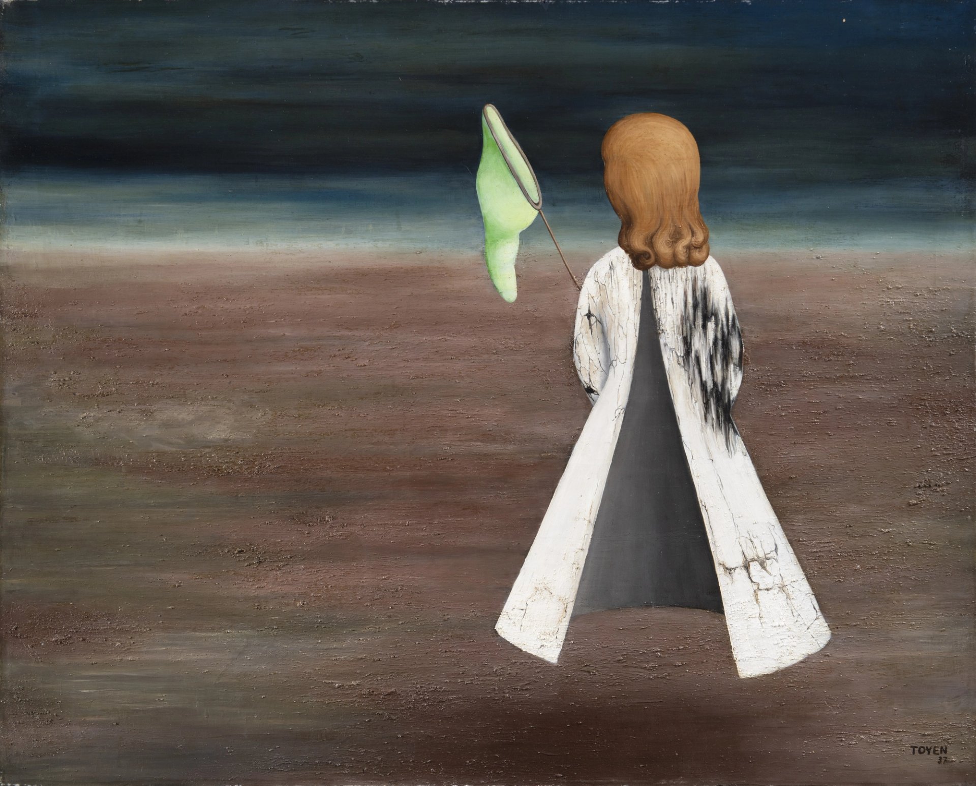 L’être, ici, est toujours à inventer, à commencer par l’artiste elle-même, insaisissable, qui, dans une réédition du Manifeste du Surréalisme, est présentée par cette phrase : « Je m’aperçois que ma page blanche est devenue verte. » L’être est une conquête autant qu’une question, ouverte, qui constamment s’adresse au spectateur, heureux et inquiet à la fois de s’y abîmer, mis sur la piste par cette formule de Radovan Ivšić dans Toyen à perte de vue : « Qui saura évaluer le trésor de révolte absolue qu’elle a laissé dans son sillage nocturne ? »