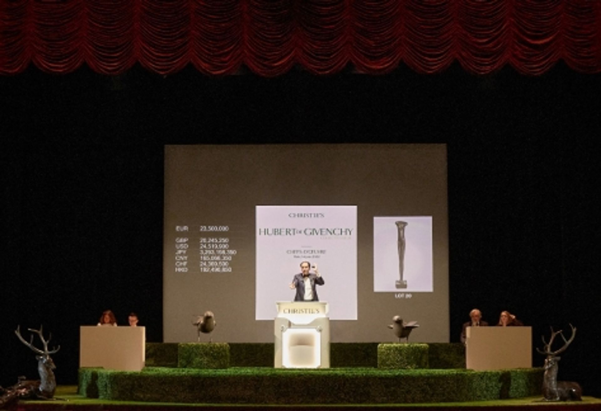 Le nom magique de Givenchy a fait crépiter les enchères le 14 juin au théâtre Marigny à Paris. Sous le marteau de Christie’s, la session de prestige, organisée en milieu d’après-midi pour toucher l’Amérique et l’Asie, a totalisé 83 millions d’euros, la vacation s’achevant « en gants blancs » : les 63 lots ont trouvé preneur. Ce résultat a d’abord été obtenu grâce à 17 enchères millionnaires. Clou de la vente, une Femme qui marche I d’Alberto Giacometti conçue vers 1932-1936 et estimée autour de 30 millions d’euros, a atteint 27 millions d’euros. Un simple oiseau en plâtre du même artiste a obtenu 4,2 millions d’euros. Une toile bleue de Miró est partie pour 6,8 millions d’euros. Au chapitre des antiquités, passion de Givenchy, un bureau plat Louis XV attribué à Joseph Baumhauer s’est vendu pour 2,3 millions d’euros, et un bureau à cylindre assez massif de David Roentgen et François Rémond, d’époque Louis XVI, pour 2,1 millions d’euros, record pour Roentgen. Hier, la vente de jour consacrée également à la résidence parisienne du couturier a engrangé 10,4 millions supplémentaires. La dispersion se poursuit aujourd’hui avec le manoir du Jonchet, ainsi qu’en ligne, avec deux ventes jusqu’aux 22 et 23 juin.