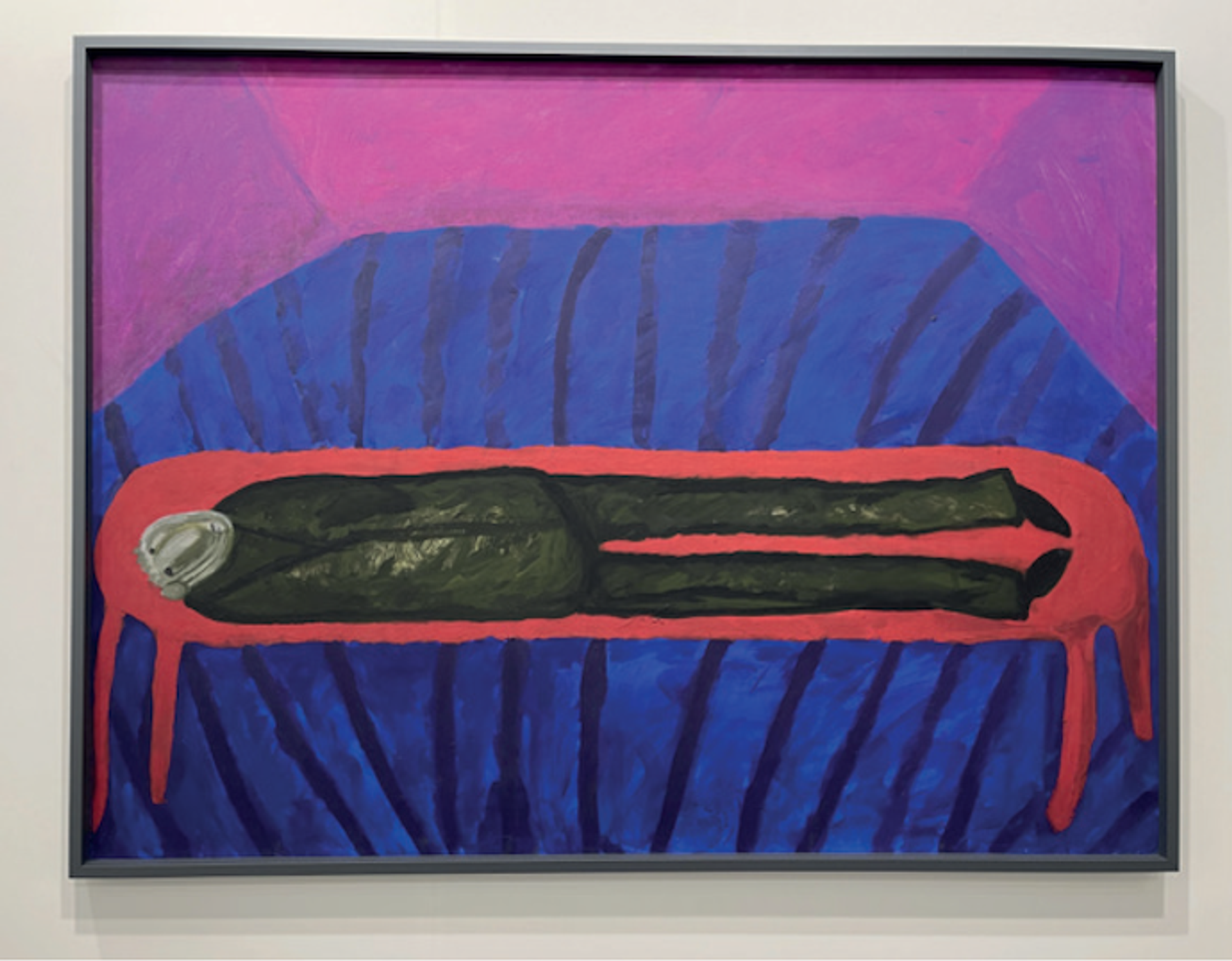 Nathalie Obadia a cédé des pièces de Shirley Jaffe, Wang Keping, Fiona Rae ou encore Laure Prouvost à « des Allemands, des Français, des Italiens, et des Libanais de Suisse », confiait-elle. Ceysson & Bénétière, pour leur première participation dans le secteur Features, au premier étage, a cédé trois œuvres sur cinq de l’Américaine Nancy Grave, décédée en 1995. Spécialiste des années 1950, Franck Prazan s’est séparé d’une œuvre d’Alberto Magnelli de… 1918, ainsi que de Karel Appel et Hans Hartung. Von Bartha a vendu une œuvre d’Imi Knoebel de 2018 à un musée européen pour 180 000 francs suisse, ainsi qu’une autre pièce de l’artiste, de 2001, pour 300 000 francs suisses. « Nous avons vu énormément de collectionneurs européens aujourd’hui, principalement des Pays-Bas, de Suisse et de France », explique Stefan von Bartha. La palme du glauque revient à la galerie Continua avec un miroir de Pistoletto montrant des enfants pendus, hommage à Cattelan de 2005, disponible hier pour 1,4 million d’euros H.T. Celle du « vert » au stand de Franco Noero de Turin avec notamment des œuvres de Henrik Olesen ou Mike Nelson. Almine Rech s’est délestée de pièces de Nathaniel Mary Quinn, Ewa Juszkiewics, Larry Poons ou encore Scott Kahn, ce dernier pour plus de 500 000 dollars. Clin d'oeil à l'Amérique récente, Air de Paris présente une oeuvre décapante sans titre d'Eliza Douglas de 2002 sur les Simpsons.