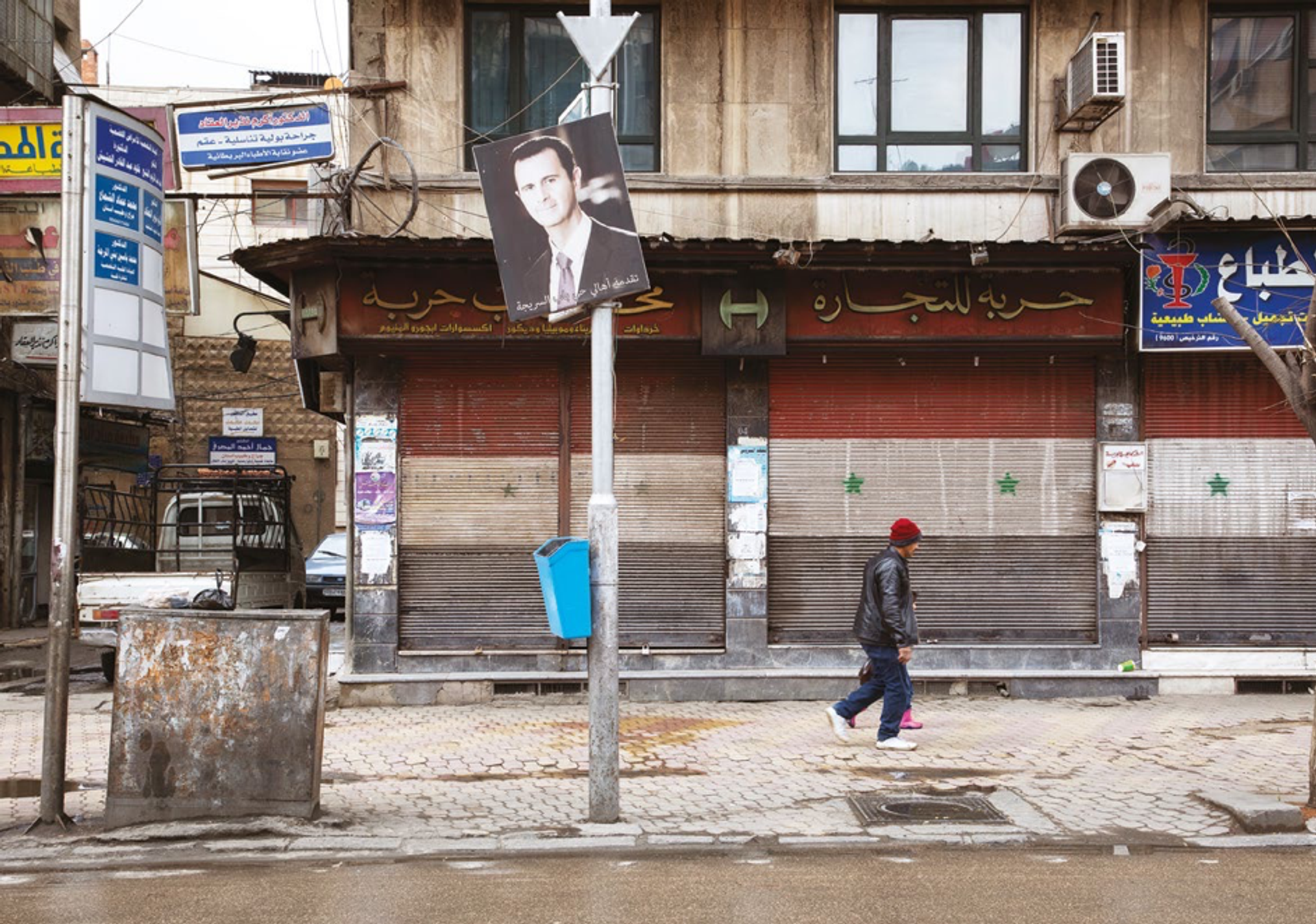 Dans ces ruines, des motifs reviennent souvent, notamment des rideaux de magasins baissés et, en Syrie, des portraits de propagande de Bachar al-Assad. C’est la figure du monstre, qui donne l’impression d’être toujours surveillé. Curieusement, il n’y a pas un portrait officiel unique, mais plein de portraits de propagande différents. Dans la multiplication de ce visage à l’infini, jusque sur les immeubles totalement détruits et parmi les étals d’une boucherie, il y a une sorte d’hyperfiguration d’un homme qui tiendrait son pays. Et, face à cela, il y a des ruines... Quant aux rideaux métalliques, qui sont apparus au fur et à mesure que j’avançais, ils sont troués à Tripoli, réparés et repeints aux couleurs du drapeau dans les villes de Syrie qui ont été reconstruites, et totalement détruits et déformés à Mossoul. Comme je suis nourri d’histoire de la photographie, le dispositif de la vitrine ou de la devanture me semblait intéressant et nécessaire pour comprendre des choses de la région, et la capacité de l’image à nous interroger sur ce visible.