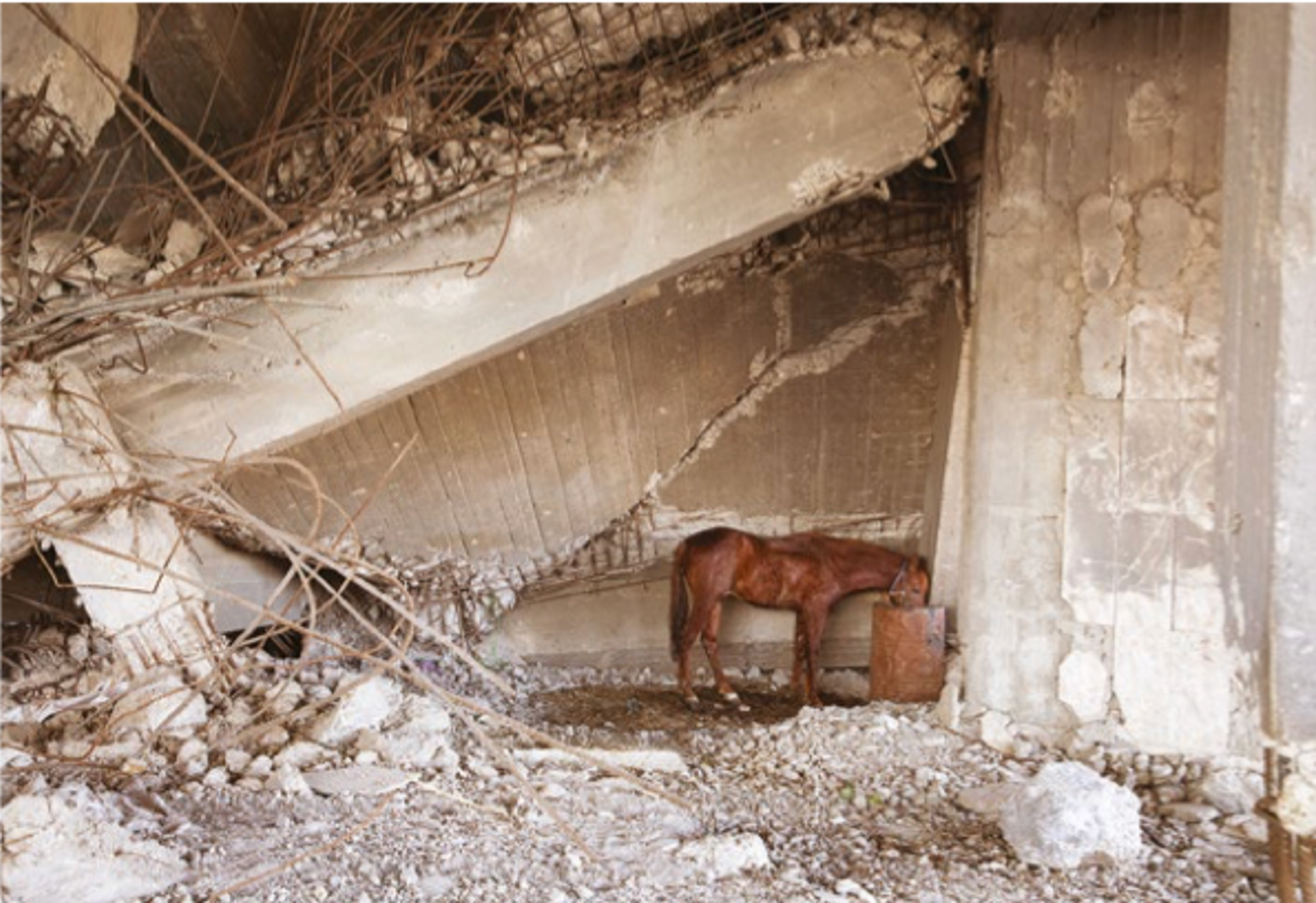 À travers la présence des visages et ce que l’on imagine des gens, on est rattrapé par l’histoire de ceux qui ont vécu en ces endroits. Il est pourtant difficile d’établir un lien entre ces images trouvées et les lieux que montrent mes photographies. La destruction de l’espace rappelle le mauvais état de ces images et empêche de se représenter ce que fut ce monde d’avant. Il y a quelque chose de l’ordre de l’irreprésentable et de l’impensable. Je photographie ce que je vois. Ce que je veux photographier, c’est la puissance du réel. C’est un peu la même chose lorsqu’on se trouve à Nimroud [en Irak] : que peut-on imaginer de cette période de l’histoire des Assyriens ? Et comment peut-on encore comprendre la folie qu’a été Daesch ? Quand je regarde mes images, j’ai parfois du mal à croire que j’ai vu ce qui y est montré. Par exemple, cette vache dans cet immeuble dévasté, était-elle vraiment là ? Aujourd’hui, l’histoire continue : celui qui m’a accompagné à Mossoul m’a écrit pour me dire que des coffres de billets avaient été retrouvés dans le sous-sol de la banque que j’avais photographiée après son bombardement – cela me paraît invraisemblable. Il en va de même pour l’histoire du garde-corps tombé de l’immeuble de mon grand-père, face auquel je me suis trouvé : cela provoque un effet de sidération.