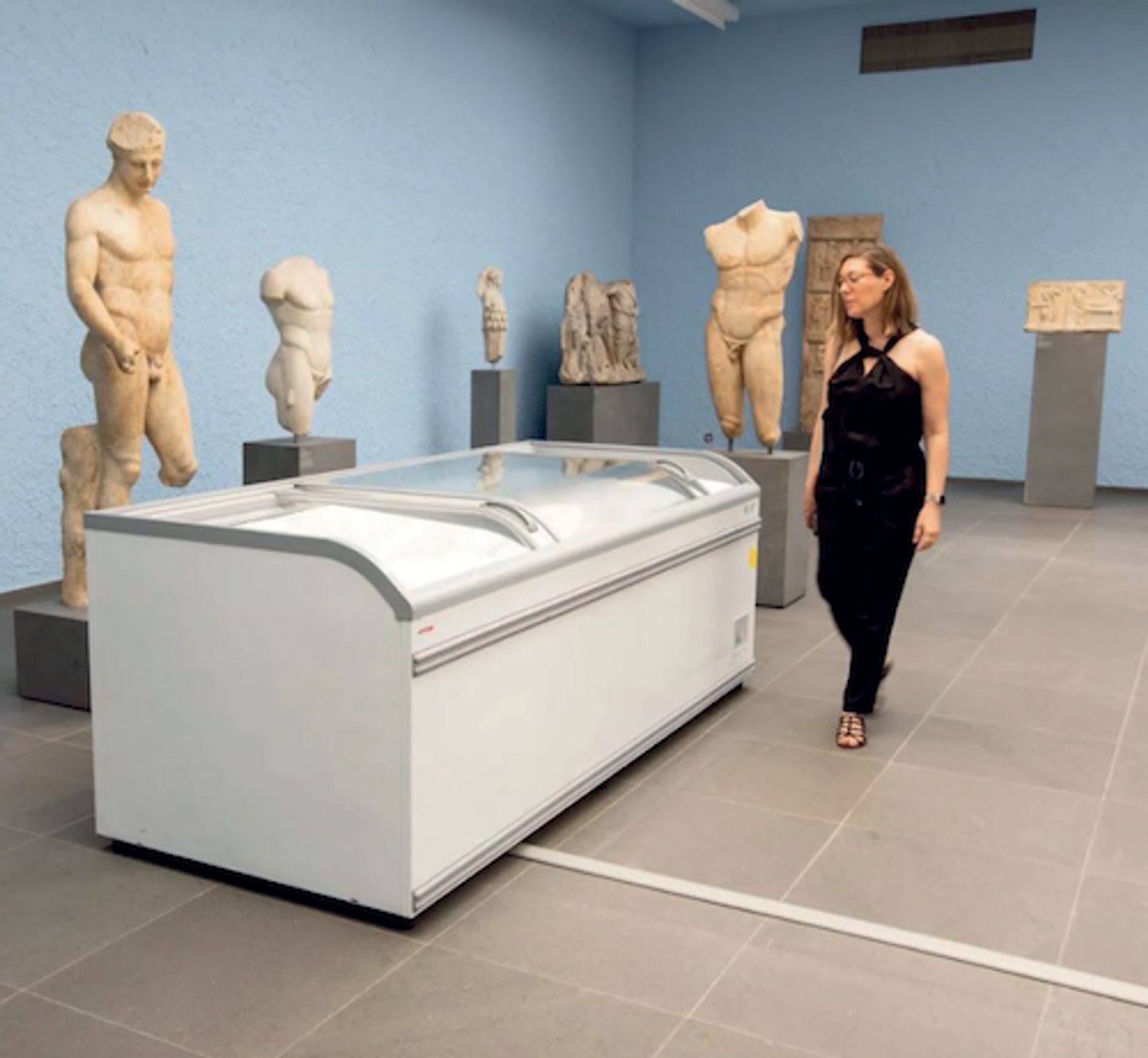 « Bojan Šarčević est un artiste basé entre Paris et Bâle. Il réalise une intervention au sein du musée des antiquités, dans l’espace de la collection permanente où est présentée la statuaire grecque classique. Il montre la variation d’une œuvre antérieure : trois congélateurs laissés à l’air libre. En ajoutant de l’humidité [à ces appareils], il crée un paysage dramatique à l’intérieur. Chaque appareil possède également son propre système sonore intégré, qui diffuse une bande-son des années 1990, époque à laquelle l’artiste a grandi. »
