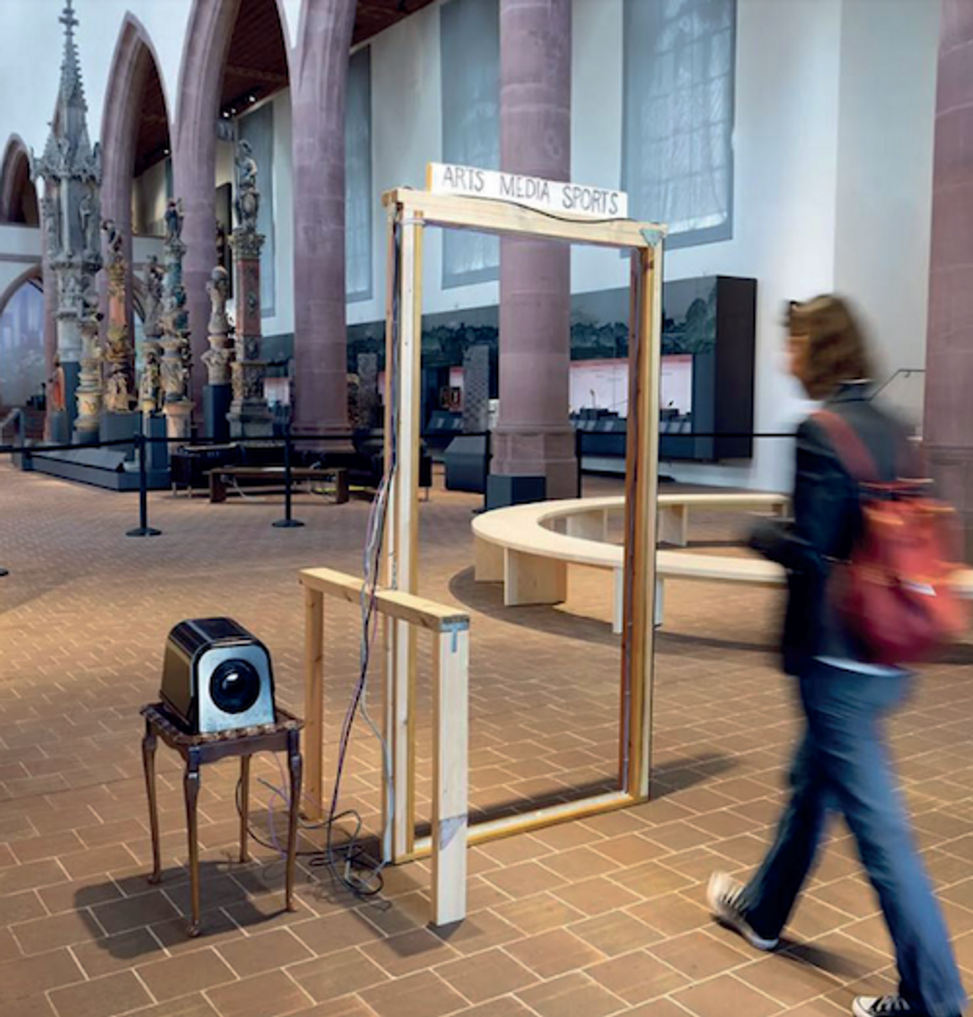 « Jimmie Durham est malheureusement décédé l’année dernière. Mais nous avons pu, grâce à sa succession, obtenir une magnifique œuvre que nous exposons à l’entrée de l’Historisches Museum. Lorsque vous entrez, vous pouvez passer à travers une sculpture. Il s’agit d’une imitation d’un portique de sécurité d’aéroport, mais au lieu d’être en métal, Durham l’a bricolé en contreplaqué. Au-dessus, il est écrit « Arts, médias et sports », comme s’il s’agissait de la [porte d’entrée] du monde de la culture. Cela montre à quel point une œuvre peut être simple – elle ne doit pas nécessairement être une imposante sculpture ou une grande installation. Elle a l’air très fragile, mais d’un point de vue politique, social, elle est si poignante : qui est à l’intérieur, qui est à l’extérieur, qui a accès, qui a le droit de dire quelque chose ? »