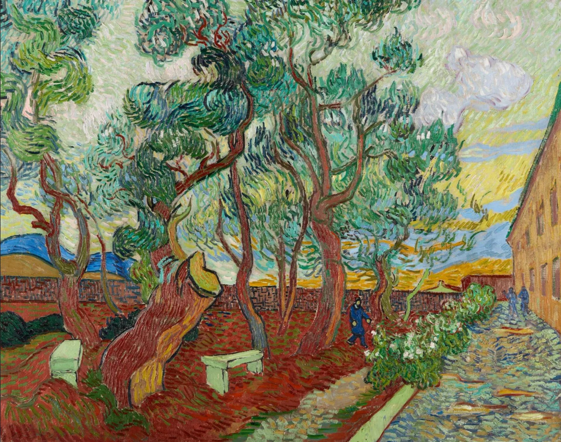 Une autre toile promise pour l’exposition de Londres est Le parc de l’asile Saint-Paul (novembre 1889) provenant du musée Folkwang d’Essen. Elle représente un enclos où les résidents faisaient de l’exercice sous les arbres, avec une vue lointaine sur les collines des Alpilles.