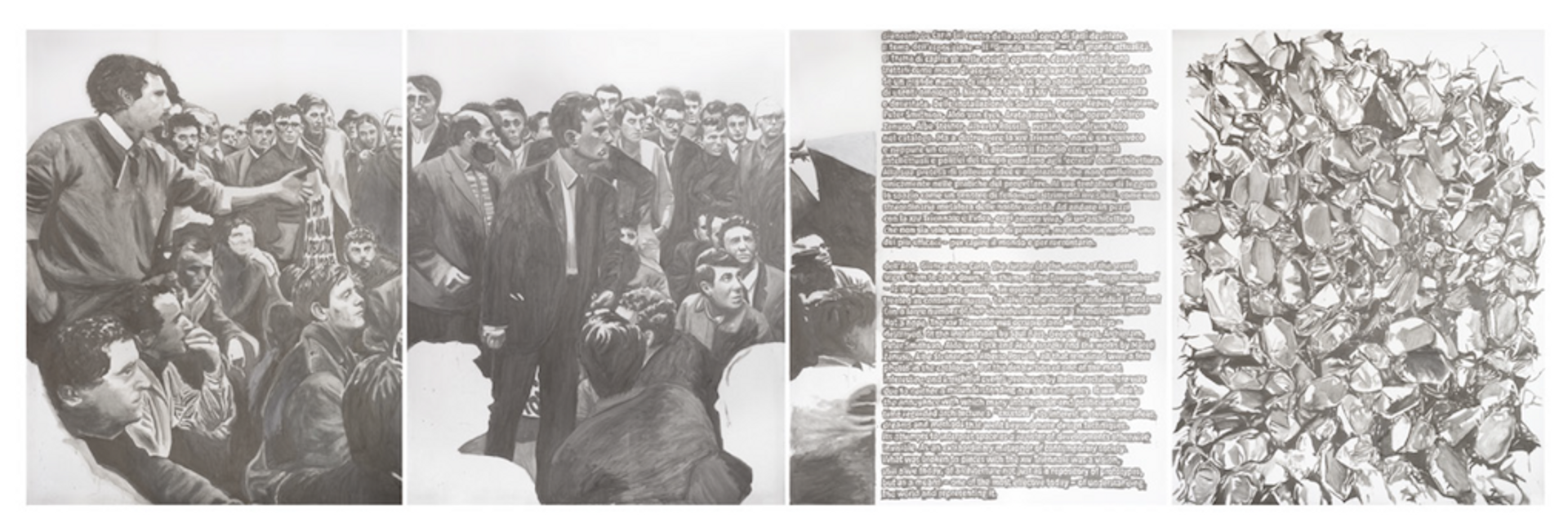 Ce premier panneau contextualisait trop mon propos. On entre à présent directement dans la composition par un groupe de personnages qui évoque la Triennale de Milan en 1968. Giancarlo De Carlo [son commissaire] revendiquait déjà l’idée selon laquelle nous étions trop nombreux : il ne fallait pas construire, mais travailler sur les interstices… L’histoire est une chose organique qui finit par se redéposer dans le temps. À l’origine, deux groupes d’individus s’affrontaient, mais j’en ai retourné un pour qu’ils regardent dans la même direction. Je me suis rendu compte aussi que, sur le troisième panneau, surtout composé de texte, toutes les lettres étaient en réserve, comme le sont aujourd’hui mes Matrices. Cela s’est fait à mon insu. Les choses étaient là, et elles se révèlent progressivement.