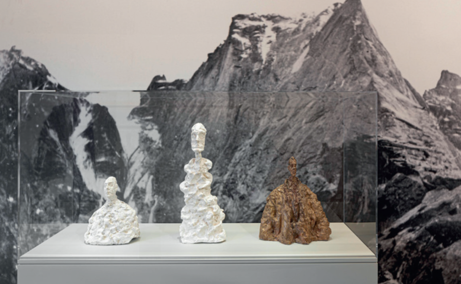 Enfin, l’agencement des œuvres et la manière avec lesquels elles se fondent dans la scénographie de l’exposition transportent le visiteur dans les forêts de la Stampa. Celui-ci arpente les salles dont les murs sont parsemés de cyprès et de paysages montagneux dans lesquels s’inscrivent les silhouettes de Giacometti. Les œuvres sont désormais envisagées sous un prisme géologique, l’exposition met-tant au jour l’image d’un artiste traversé par un souffle minéral.