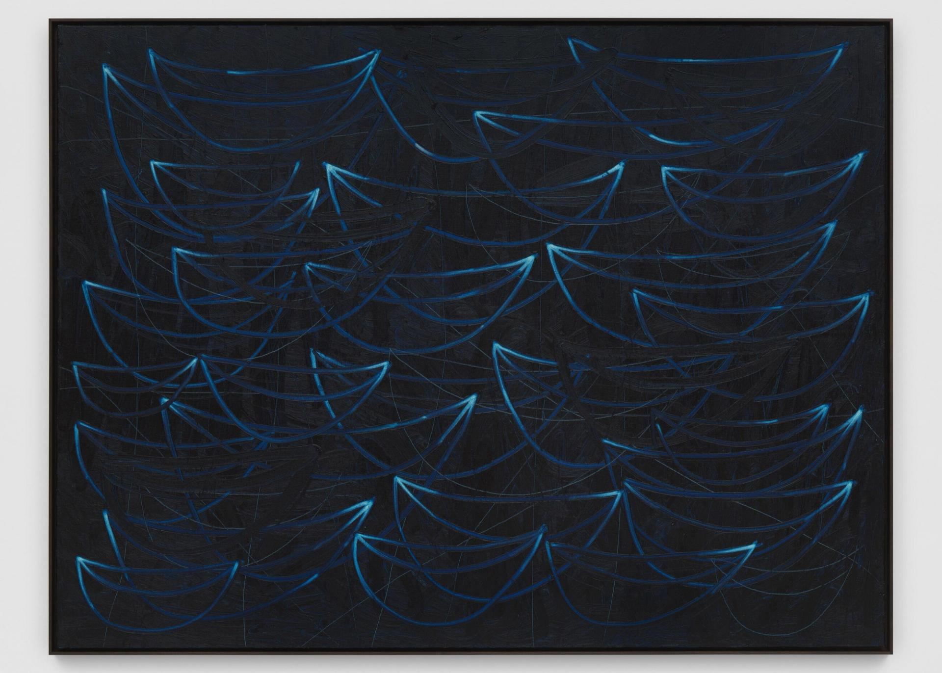 L’exposition revient sur mon travail, avec des œuvres récentes, montrées pour la première fois. Sodade est un mot portugais qui suggère un peu de tristesse, de la mélancolie – ce que j’ai ressenti ces dernières années –, mais aussi l’expression de la nostalgie et du déplacement. Cette chanson est un exemple incroyable qui illustre ce sentiment. Mon exposition à Hauser & Wirth Menorca est un moyen d’explorer ce voyage. J’ai commencé le premier ensemble d’œuvres, les Seascapes, ces paysages marins bleus, lorsque je vivais à Long Island, près de New York, en bord de mer. J’avais un bateau, j’ai éprouvé ces moments de singularité face à l’océan. Ces dernières années, nous avons tellement commenté la peinture : est-ce politique, de la contemplation ? Il est temps de penser que c’est un sujet collectif. Ce sont des motifs de bateaux, même si, par exemple, mon fils refuse de les voir comme tels ! Ces vaisseaux stylisés vous portent, c’est l’idée de transition, mais aussi de coexistence ; tous ces bateaux individuels forment une communauté, ensemble, dans une synchronicité.