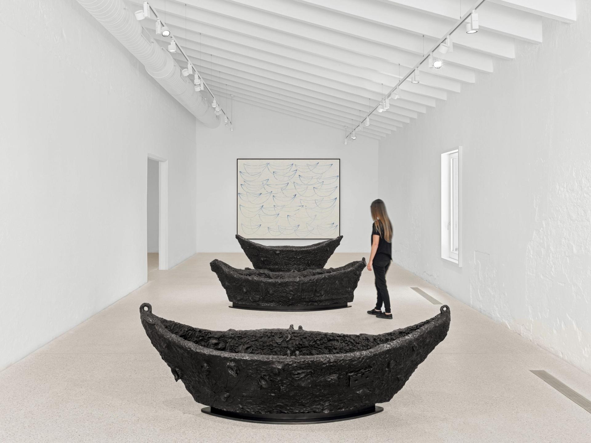 Un autre corpus présenté dans l’exposition s’intitule les Surrender Paintings. Elles ressemblent à de la fumée, quand quelque chose se dissipe. Ces peintures blanches, réalisées sur lin, sont une combinaison de plusieurs aspects de ma pratique et un bon exemple de l’évolution de mon travail, cette idée d’abandon. Non pas comme un échec, mais une reconnaissance de l’opportunité de donner afin de recevoir. Je présente aussi des sculptures de bateaux, prévus pour un passager, qui font écho à mes tableaux. Lorsque je vois des sculptures, j’ai toujours envie de les toucher. Si vous allez à Marfa, au Texas, dès que le guide laisse le groupe, les gens ne peuvent s’empêcher d’aller dans les sculptures de Donald Judd…