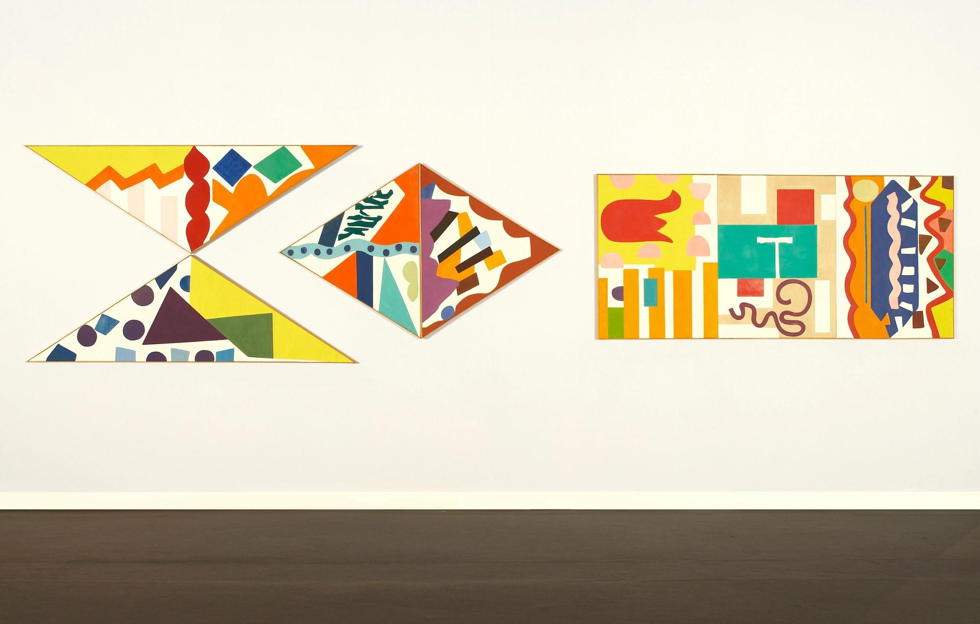 Tout en restant abstraite, son œuvre opère un virage stylistique saisissant à la toute fin des années 1960, ce que certains de ses congénères américains considéreront comme une trahison. Dans ces compositions se lit l’influence des papiers collés de Matisse que l’artiste a vus exposés par François Mathey au musée des arts décoratifs de Paris en 1961 et qui l’ont beaucoup marquée. S’affirment des aplats de couleur et des agencements de formes géométriques qui deviendront jusqu’à la fin de sa vie son style. L’exposition comprend par exemple l’ensemble de toiles réunies sous le titre Malibu et réalisé en 1979, commande privée pour une chambre d’adolescent.