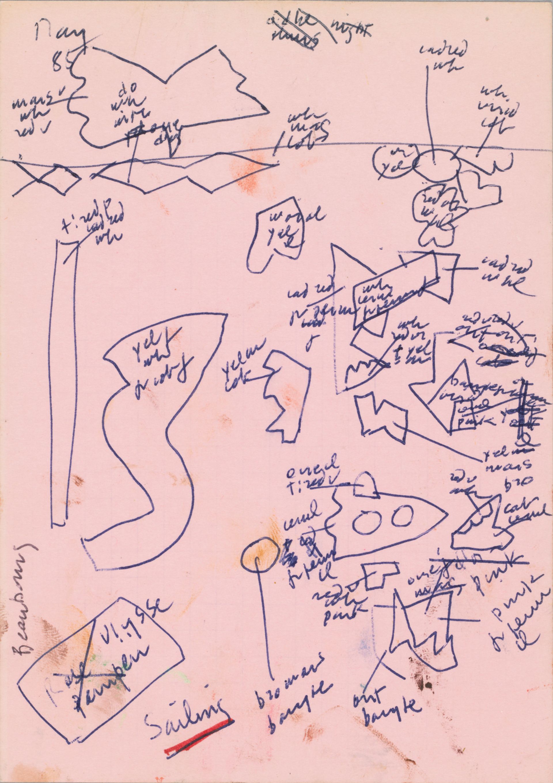 Shirley Jaffe, Mémo retraçant l’évolution d’un tableau en cours, 15 x 10 cm, fiche Bristol. Bibliothèque Kandinsky, Mnam-Cci, Centre Pompidou - Adagp, Paris, 2022