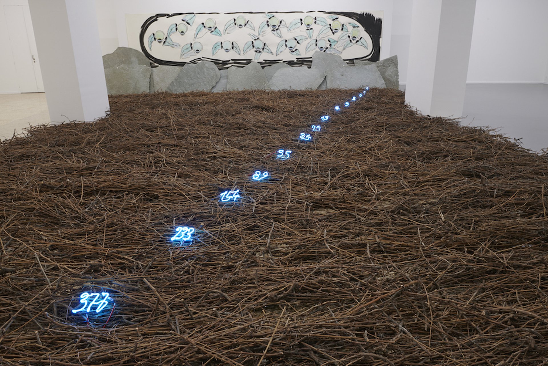 Mario Merz, Senza titolo, 1985, technique mixte sur papier, pierres, fagots, néon, env. 1 400 x 700 x 200 cm. © Musée d'art et d'histoire de Genève. Photo : J.-M. Yersin