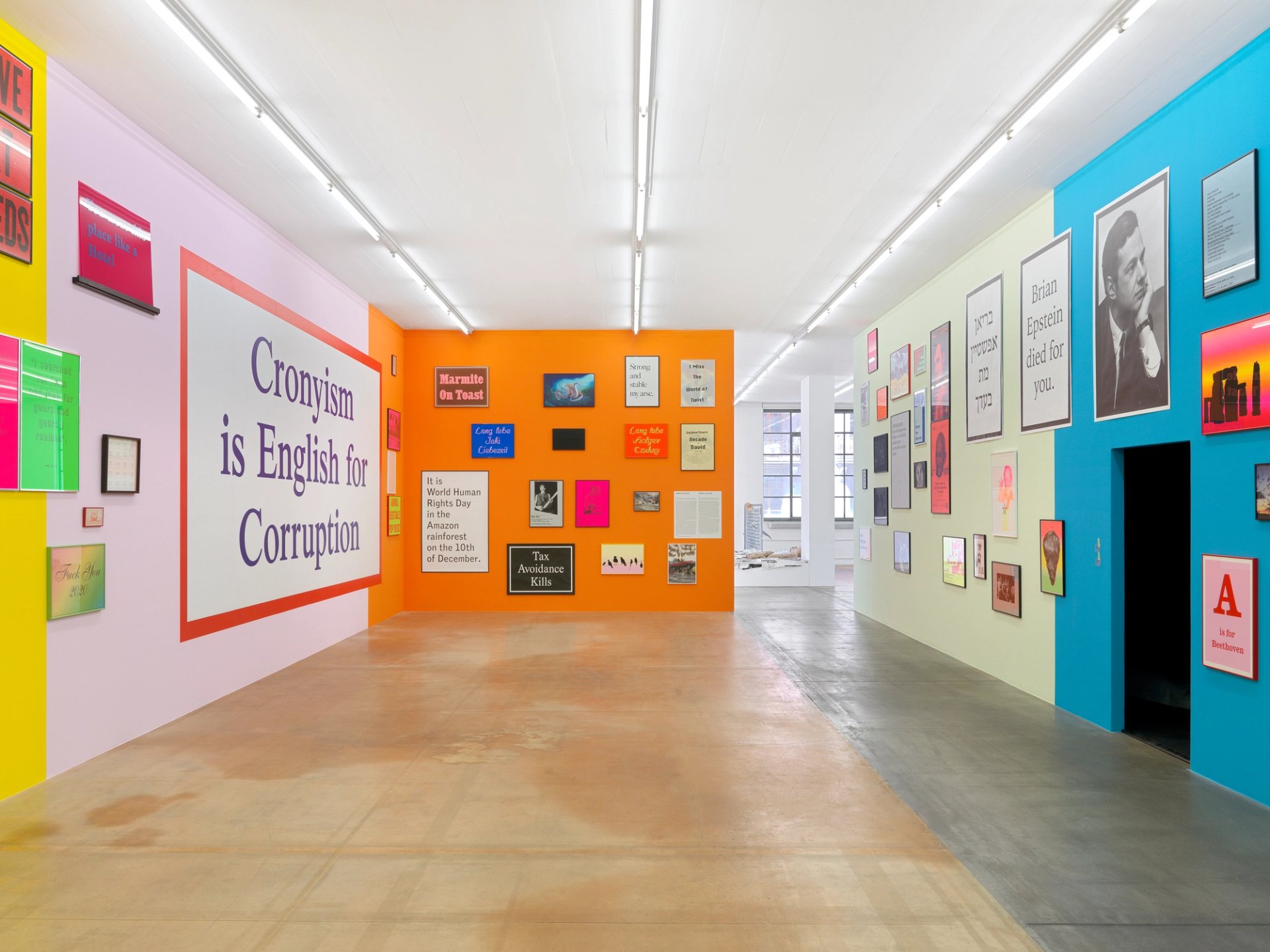 Les murs ont été peints en couleur avec, par-dessus, des affiches encadrées ou collées à même la paroi. L’ensemble appartient à Jeremy Deller, artiste britannique de 66 ans en révolte permanente contre les injustices et les absurdités politiques de son pays, mais aussi fasciné par les transformations de la culture à travers l’histoire. « J’avais travaillé avec lui à l’époque de sa carte blanche au Palais de Tokyo en 2008, explique Julien Fronsacq, commissaire de cet accrochage. Il a étudié la sociologie et en comprend parfaitement les mécanismes. C’est quelqu’un qui pose la question de notre situation dans la société et de la possibilité d’énoncer un discours critique sur celle-ci tout admettant en faire partie. »
