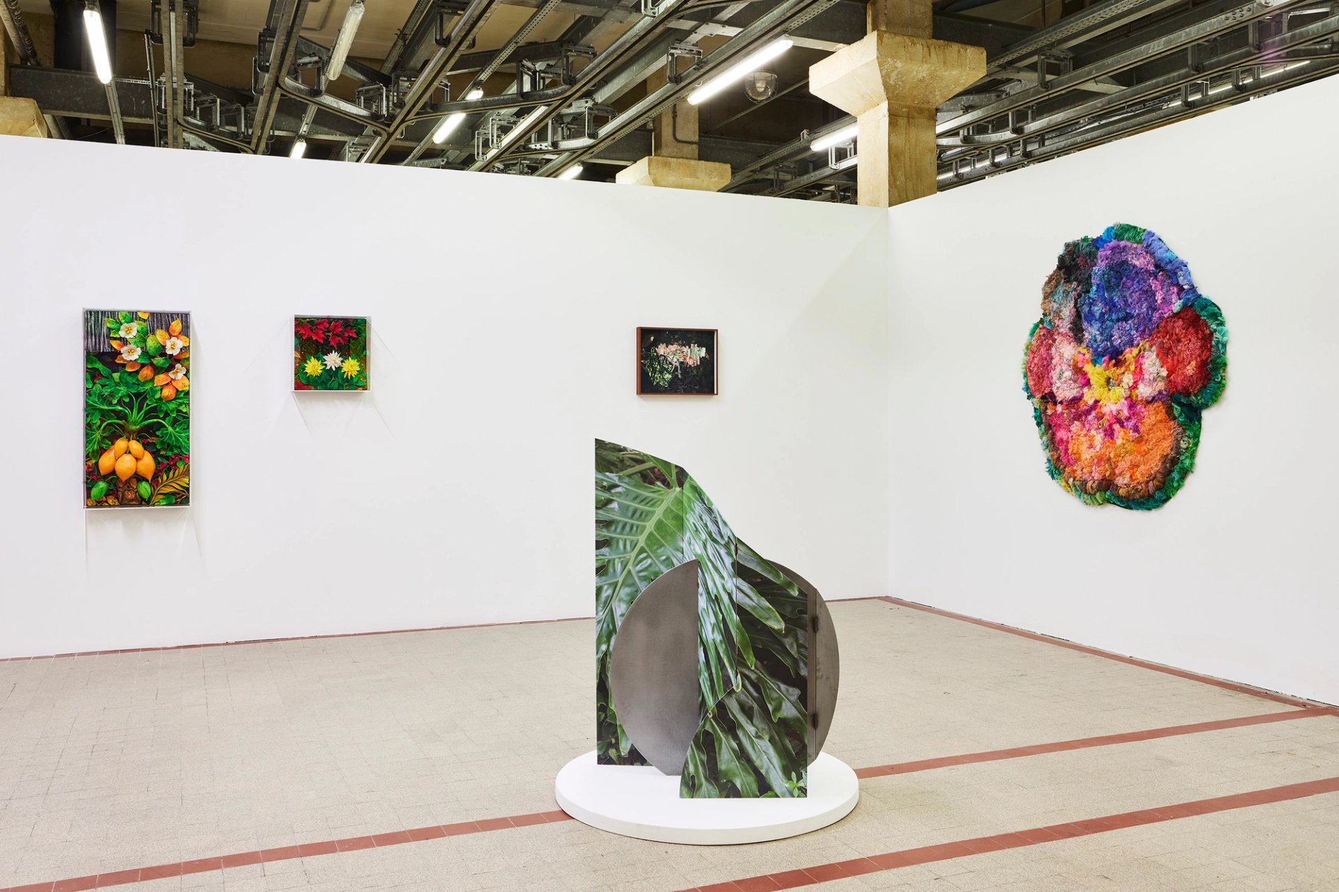 L’exposition s’ouvre, au centre de l’immense nef, par une évocation de la sensualité, avec entre autres un nez imposant et presque inquisiteur de Loup Sarion, invitation à humer ce qui va suivre. Sur la gauche, une vaste section s’empare de plusieurs thèmes dans l’air du temps, tel l’environnement. L’Italien Piero Gilardi, cofondateur de l’arte povera, qui a abordé ce thème dès les années 1960, est présent ici avec de récents vrais-faux tapis-nature en mousse artificielle. Ad Minoliti, dans un grand wall-painting – l’une des œuvres conçues pour l’exposition – dresse une cartographie des territoires argentins, critique de la politique environnementale de son pays. Autre critique voisine : celle du Brésilien Caio Reisewitz, dont les photomontages traduisent le grignotage de la nature par les mégapoles bétonnées. Moffat Takadiwa, du Zimbabwe, procède par recyclage de déchets métamorphosés en guirlandes de fleurs. La section prend une couleur plus engagée encore, plus politique avec le travail de Michèle Magema, originaire du Congo, qui interroge le territoire mais aussi celui de Daniele Otero-Torres autour du datura, plante colombienne aux mystérieuses propriétés psychotiques, et qui questionne aussi plus loin l’indépendance du Brésil…