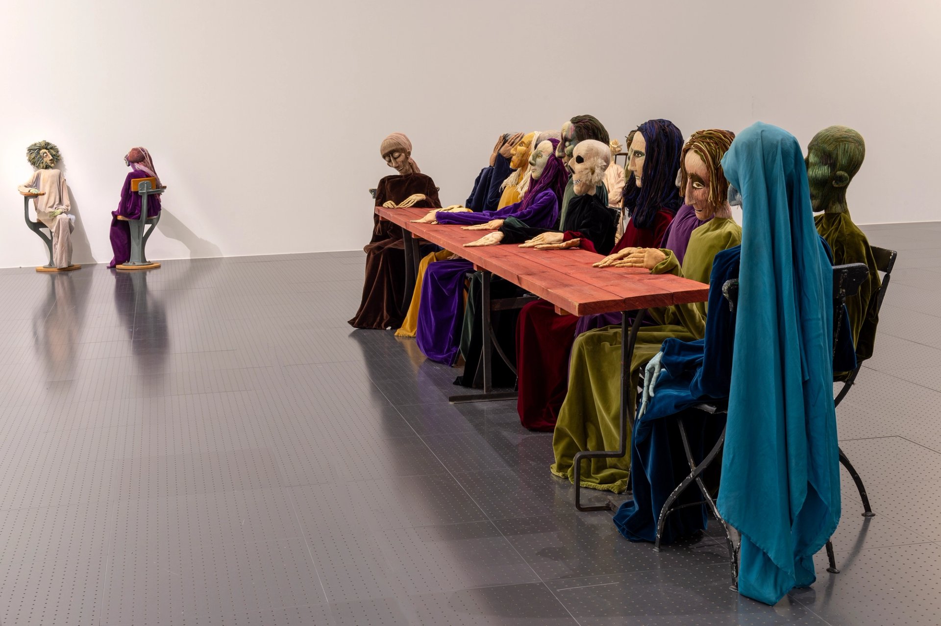 Au milieu des années 1960, Eva Aeppli distille ces mêmes thèmes par le biais d’un médium radicalement différent : des figures textiles à taille humaine tels des pantins désarticulés, rembourrées de kapok et vêtues de soie. On les croirait échappées de ses toiles. Ainsi en est-il de la pièce L’Aube/Les Juges, composée d’une toile éponyme et de sept personnages assis. Autre installation majeure, également présentée : La Table, 13 figures aux visages grimaçants, assis autour d’une table oblongue et rejouant La Cène. Lugubre commensalité !