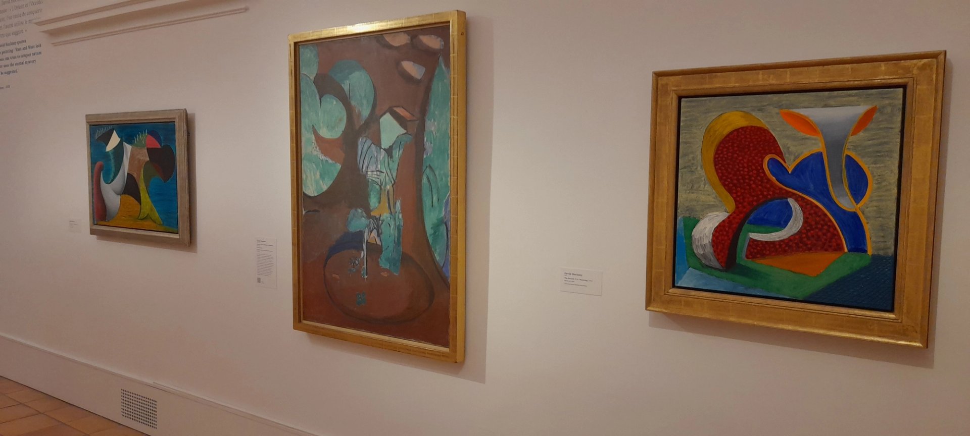 Pendant ses études à la Royal Academy de Londres, Hockney a fait un mémoire sur le Fauvisme. Sa palette comme sa vision du corps change au contact de Matisse. Dans les salles consacrées aux portraits et autoportraits, l’influence est flagrante. Autre point de rapprochement : le paysage. L’accrochage impeccable rapproche le jardin de Matisse à Issy de 1917, parmi les œuvres les plus abstraites de l’artiste, prêt de la Fondation Beyeler (Riehen), de deux VN Paintings de Hockney de 1992 qui les encadre. Plus loin, les affinités sont plus que patentes dans la palette et le goût des motifs luxuriants, tant chez Matisse que chez Hockney, qui s’inspire de la végétation exotique de Los Angeles, un œil sur le travail du Français. En définitive, il n’y a que dans les nus masculins, parfois assez audacieux, qu’Hockney diverge sensiblement de son aîné, peu attiré par le sujet. Et encore : Hockney emprunte - consciemment ? - à Matisse la palette et la cadrage de certains motifs marocains...
