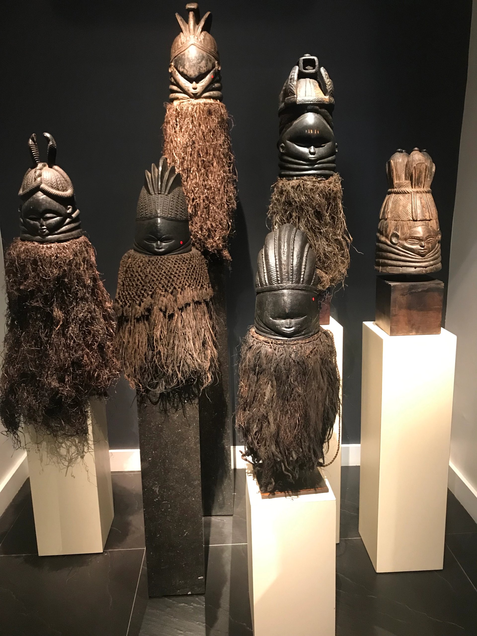 Ensemble de masques à heaume Sowei chez Abla et Alain Lecomte. Photo : B. G.-S.