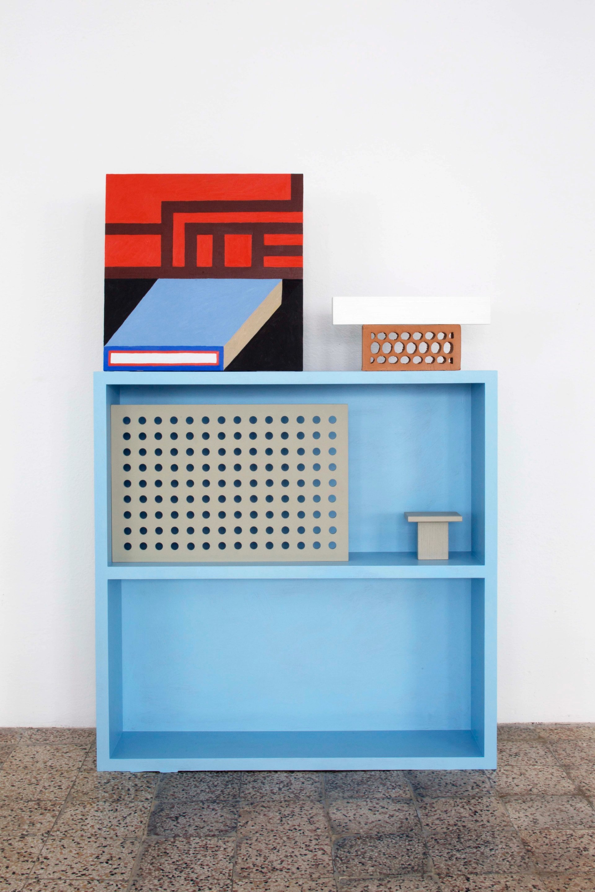 Nathalie Du Pasquier, Sans titre, huile sur toile, bois peint et briques, 2021. © Alice Fiorilli