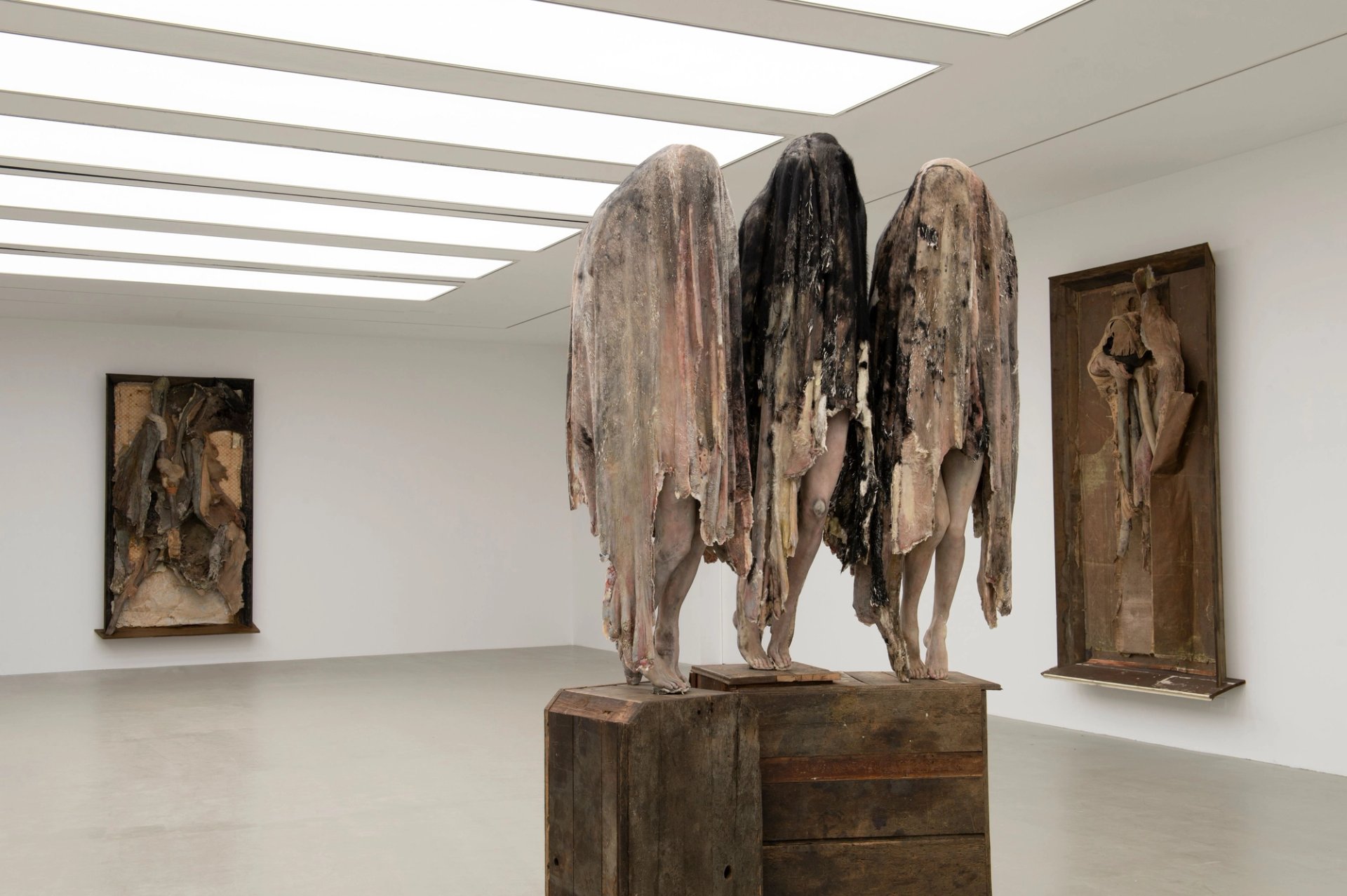 C’est en 2020, dès le début de la pandémie du Covid-19, « où le besoin d’être porté et protégé était manifeste », dit-elle, que Berlinde De Bruyckere a commencé la série des Arcangelos, même si ce besoin traverse son œuvre depuis des années avec les Couvertures. Cependant, ce que l’on retiendra avant tout de cet ensemble est le retour non pas tant de la figure (les visages sont invisibles) que de la silhouette humaine, absente de ses sculptures depuis une dizaine d’années déjà. Un groupe de trois archanges solidaires ne manque pas de faire songer, de par leur posture, aux Bourgeois de Calais, de Rodin, alors que trois autres de ces silhouettes énigmatiques, disséminées dans la salle, semblent faire contrepoint avec les gigantesques tableaux muraux de la série On aurait presque dit un lis (It Almost Seemed a Lily, 2017-2019).
