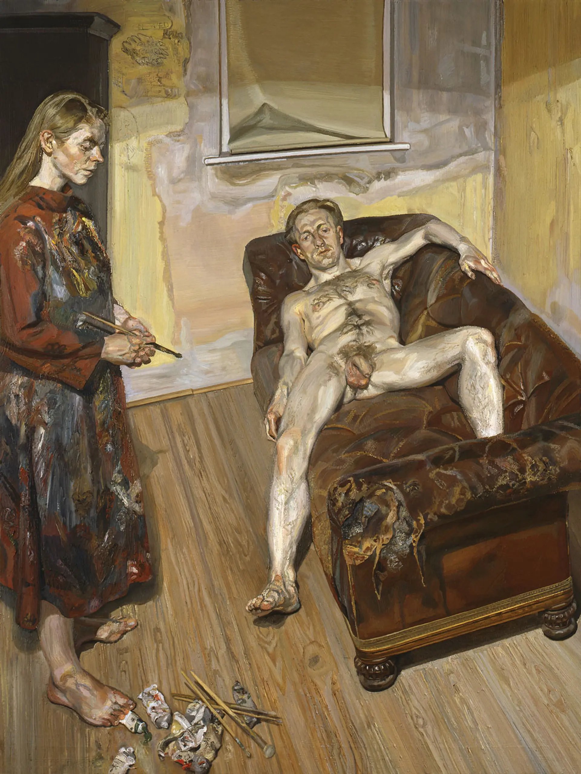 Daniel F. Herrmann tient à souligner le lien personnel qu’entretenait Lucian Freud avec la National Gallery, où il était parfois autorisé à se promener après les heures d’ouverture. C’est là que l’artiste a développé un intérêt pour les références aux chefs-d’œuvre dans ses propres tableaux, notamment dans Large Interior W11 (after Watteau) (1981-1983), inspiré par le peintre français du XVIIIe siècle. Mais Herrmann cite également l’autoportrait nu de Freud, Painter Working, Reflection (1993), qui, selon le conservateur, fait allusion à la fois au tableau de Vincent van Gogh représentant ses bottes et à l’autoportrait de Michel-Ange en saint Barthélémy, représenté tenant sa propre peau écorchée.