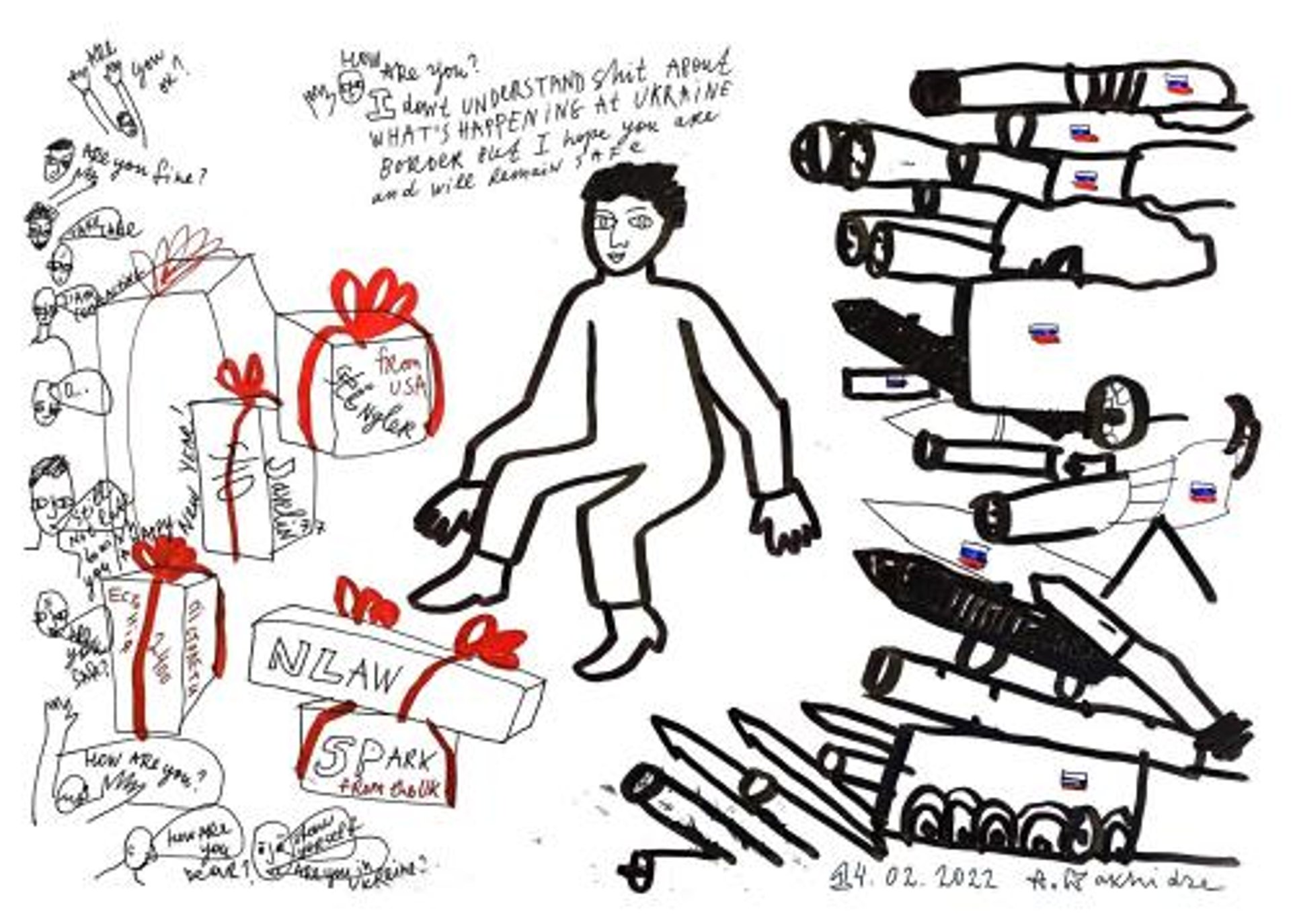 Alevtina Kakhidze, Wartime. A New Chapter of the Russia-Ukraine War Dated From 24.02.2022. Diary Drawn 26 km From Kyiv, 2022. Courtesy de l'artiste et galerie Nadja Vilenne