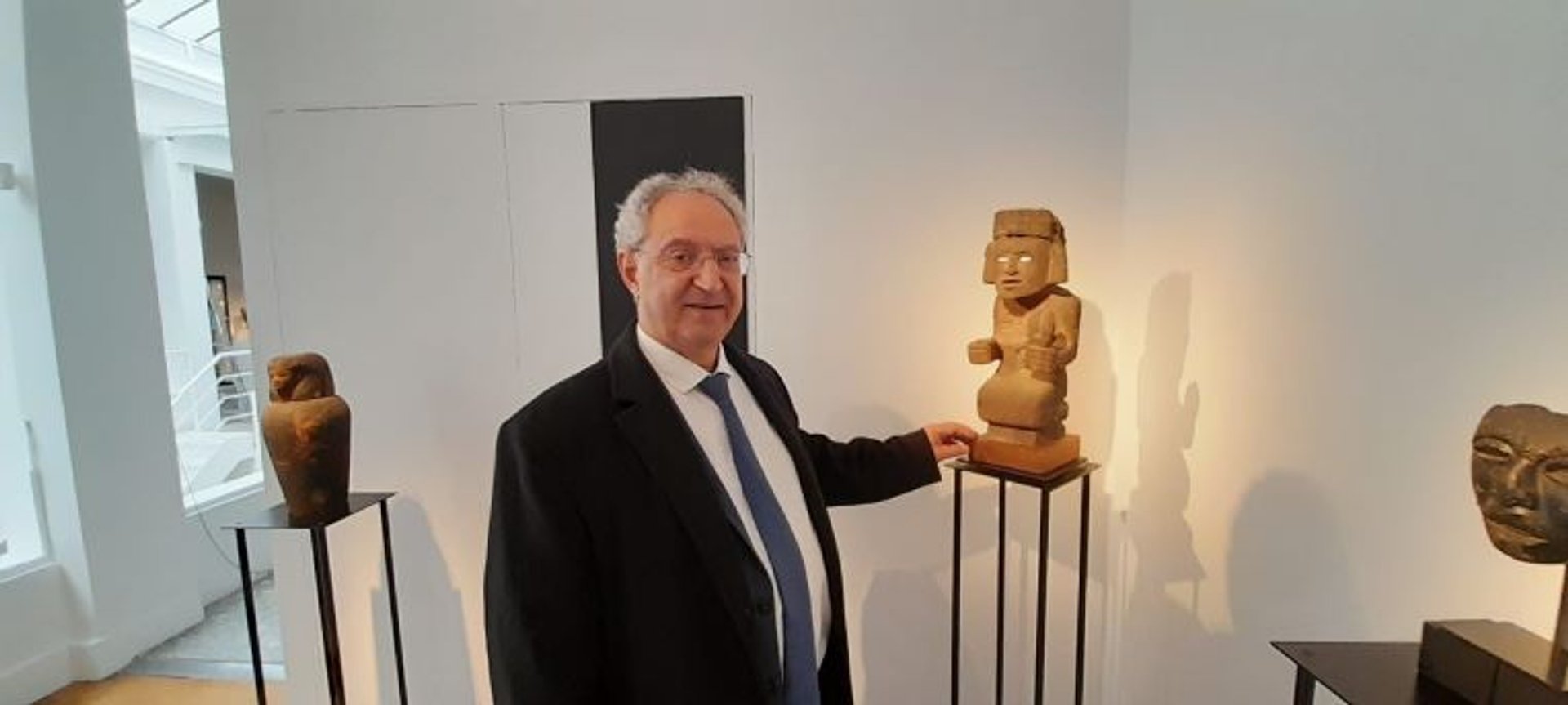 Le marchand Laurent Dodier présentant le clou de son stand, une statuette aztèque. Photo : D.R.