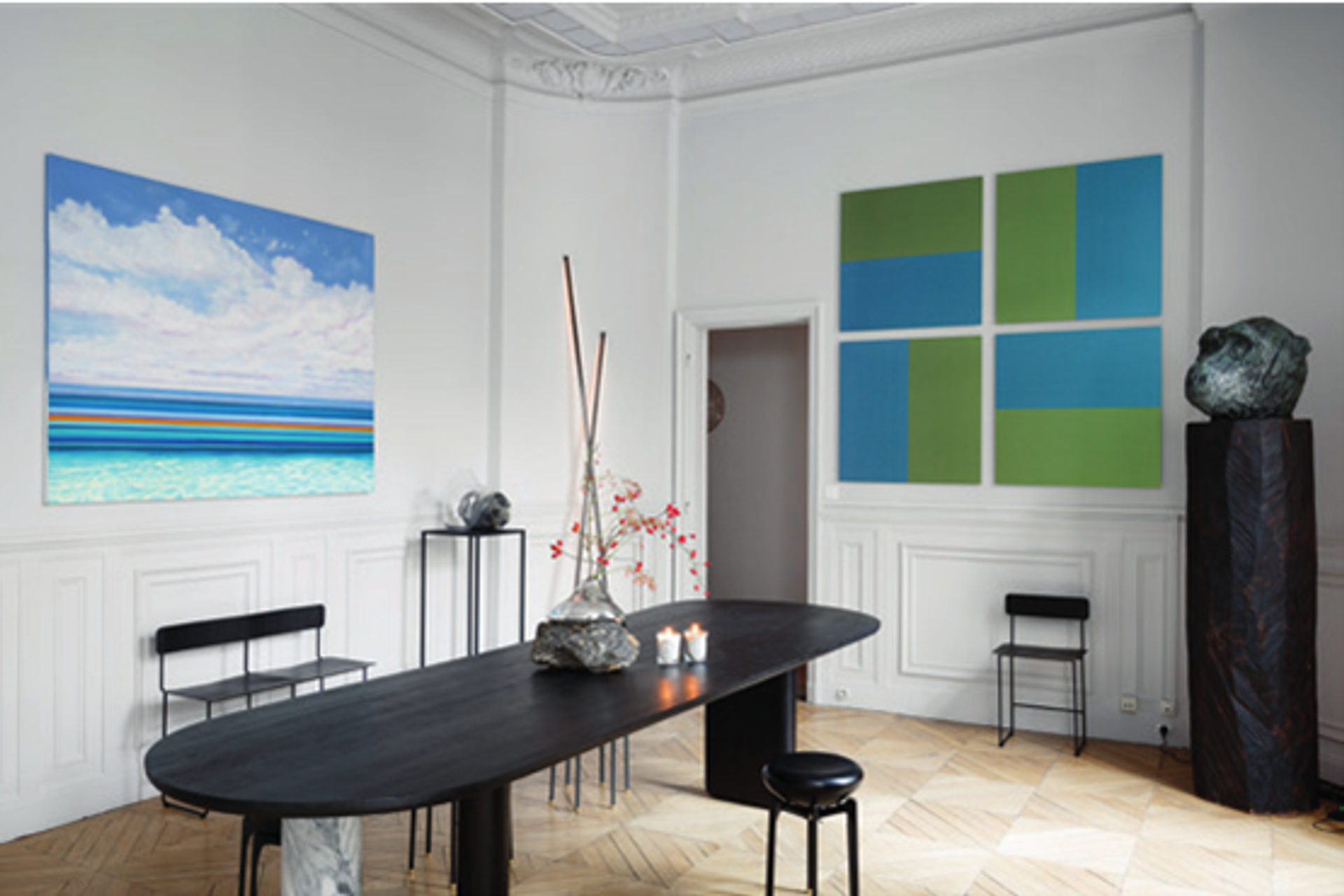 Cette année, le fil rouge du salon est la « ligne de vie » ainsi que le travail sur la matière, à l’instar des créations de Lionel Sabatté au 3e étage (de 3 500 à 7 000 euros). La thématique est mise en lumière dans la salle à manger du 2e étage, où autour d’une table en bois brûlé avec un pied en marbre de Caroline Andreoni (à 12 900 euros) s’instaure un dialogue entre les paysages figuratifs traversés de lignes colorées horizontales d’Olivier Masmonteil (entre 5 700 et 19 600 euros) et d’Olivier Mosset (3 200 euros).
