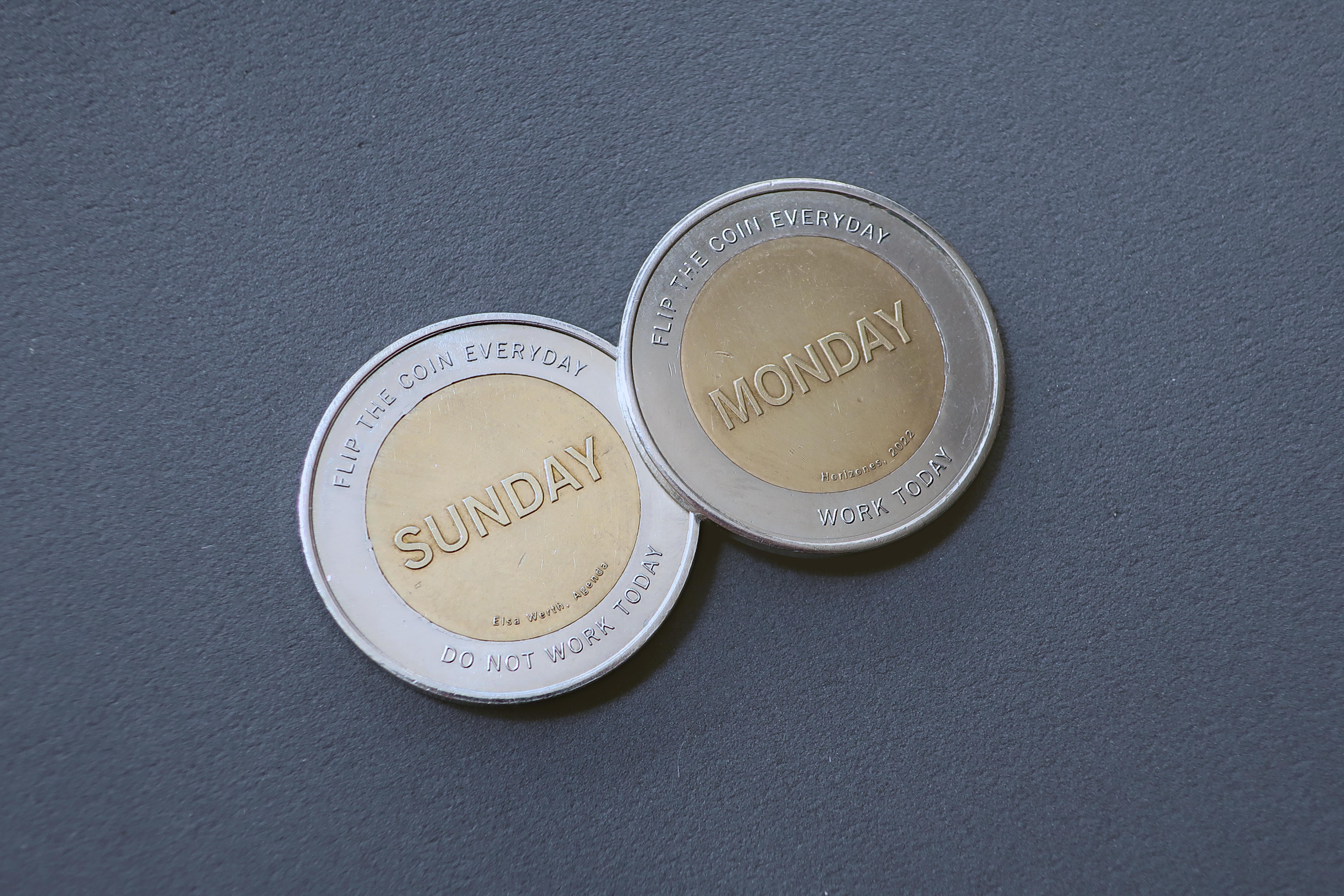 Elsa Werth, Agenda, 2022. Pièce en métal gravée offerte, 2,75 cm de diamètre, 1000 exemplaires. Production : Fondation Pernod Ricard dans le cadre du 23e Prix Fondation Pernod Ricard. Crédit photo : Aurélien Mole