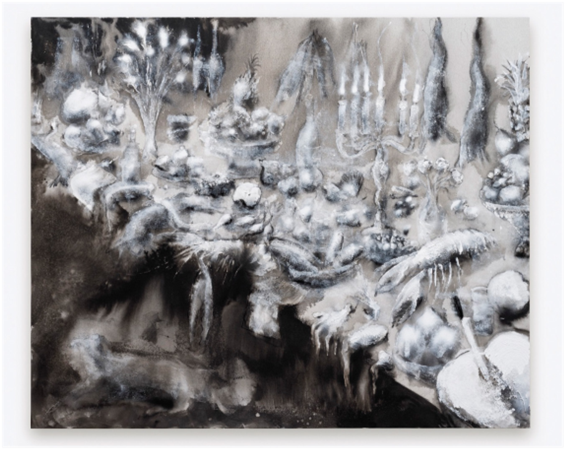 Miquel Barceló, Nature morte avec gâteau d’anniversaire, 2021, technique mixte sur toile. © Miquel Barceló. Photo Charles Duprat