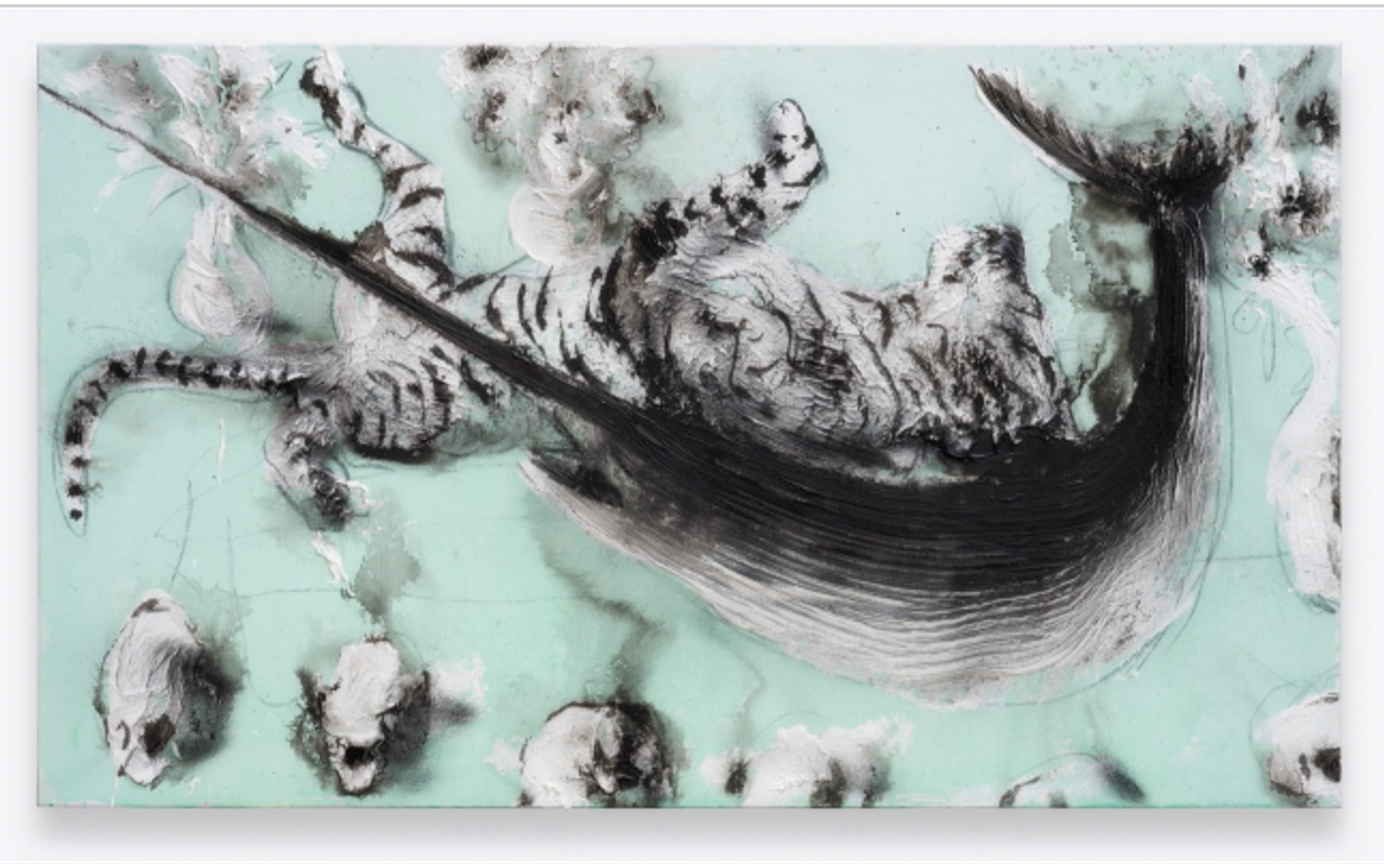 Lorsque je suis arrivé à Majorque il y a quelques mois, je venais donc de passer un peu de temps au Kenya. J’avais une grande toile crue sur laquelle j’ai commencé à improviser avec un gros fusain. Puis cela a pris la forme d’une table. J’ai mis mon chien sous la table, puis je l’ai oubliée. Un peu plus tard, j’ai peint par-dessus, comme pour effacer, mais en sui-vant mon dessin. Je me suis rendu compte que je peignais en effaçant.
