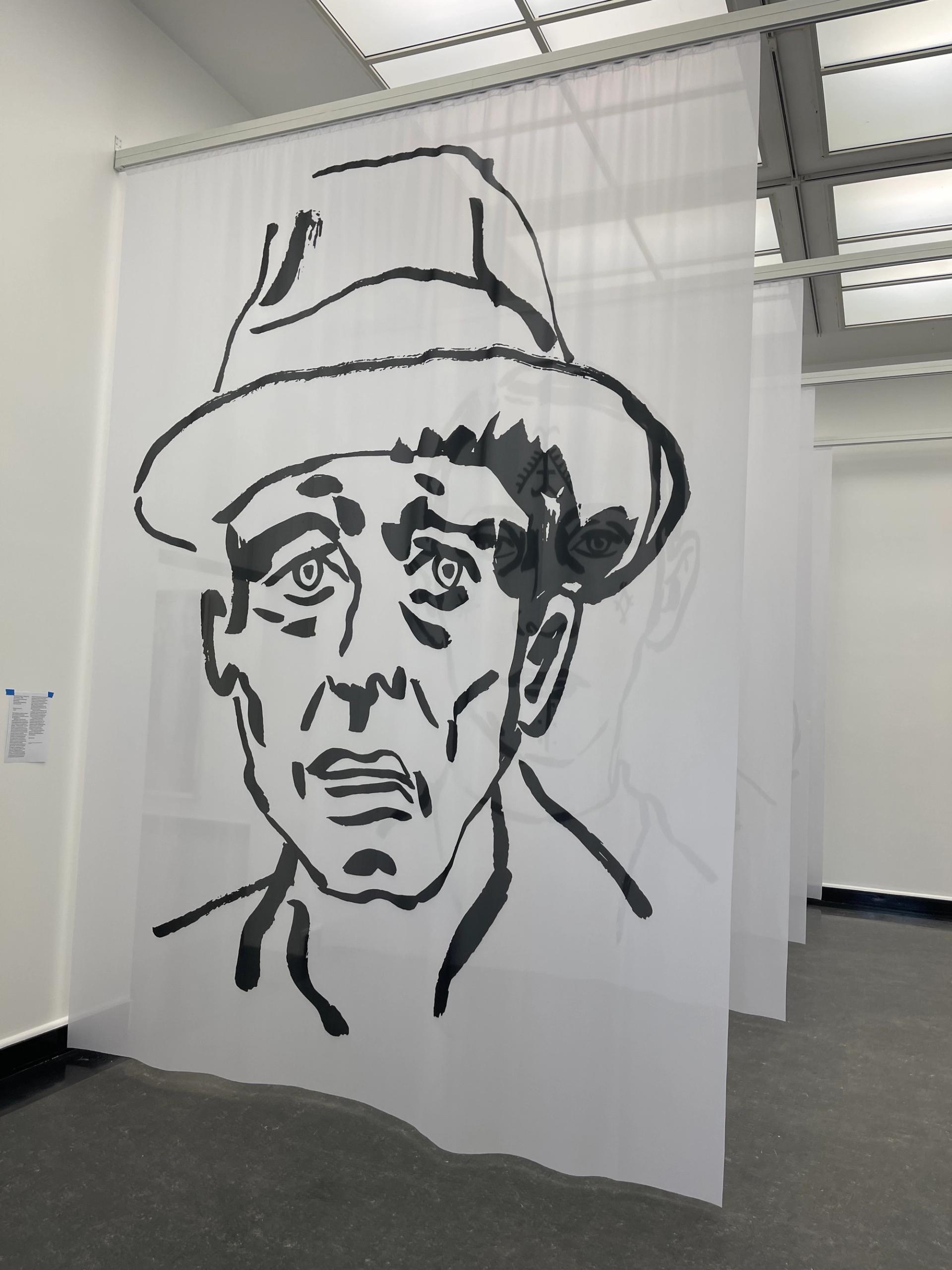 Toute la triennale est construite à partir de cette figure géométrique à sept côtés, les expositions se répartissant dans sept lieux différents de Bergen, réunissant à chaque fois trois artistes, pour arriver au nombre de vingt et un. La Bergen Kunsthall, site du Bonimenteur, constitue l’un des points nodaux du parcours. D’abord parce que c’est dans cet espace qu’est présenté sur écran le texte intégral de la pièce de théâtre écrite par Thomas Clerc. Ensuite parce que se déploient dans la première salle de larges étendards en tissu sur lesquels ont été reproduits les visages des sept acteurs de cette cosmogonie tels que les a façonnés Neue Gestaltung. Cette agence berlinoise a conçu l’identité visuelle de Bergen Assembly 2022, des magazines aux affiches et à la signalétique, des dessins à l’écriture manuscrite, le tout en noir et blanc. Les personnages prennent ici la physionomie d’acteurs réels du monde de l’art, à l’exemple du Bonimenteur ressemblant à Jeff Koons, du Professeur prenant les traits de Joseph Beuys, ou du Touriste que l’on pourrait confondre avec Hans Ulrich Obrist. Sur le même site sont présentés les peintures étranges de Bernhard Martin et le foyer chaleureux de GRAU, duo des frères designeurs Timon Grau et Melchior Grau.